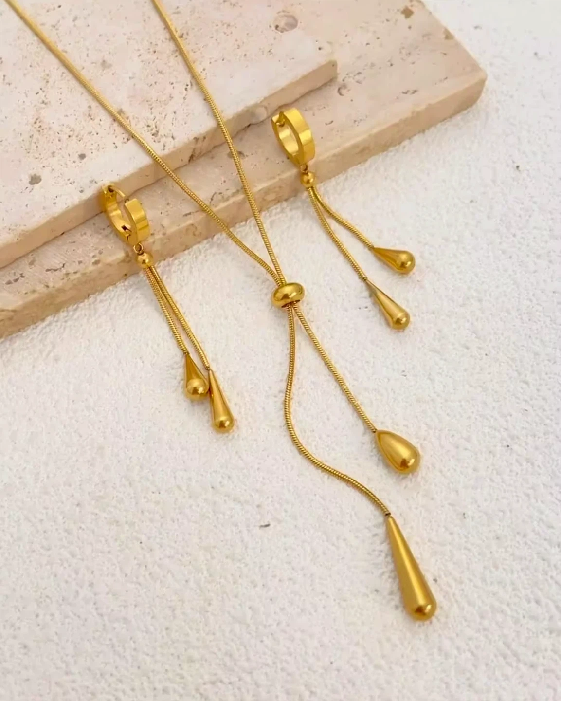13Gorgeous non tarnish gold-toned necklace and earrings set! The necklace features a unique lariat style with teardrop accents, and the matching earrings complete the look. Perfect for adding a touch of elegance to any outfit