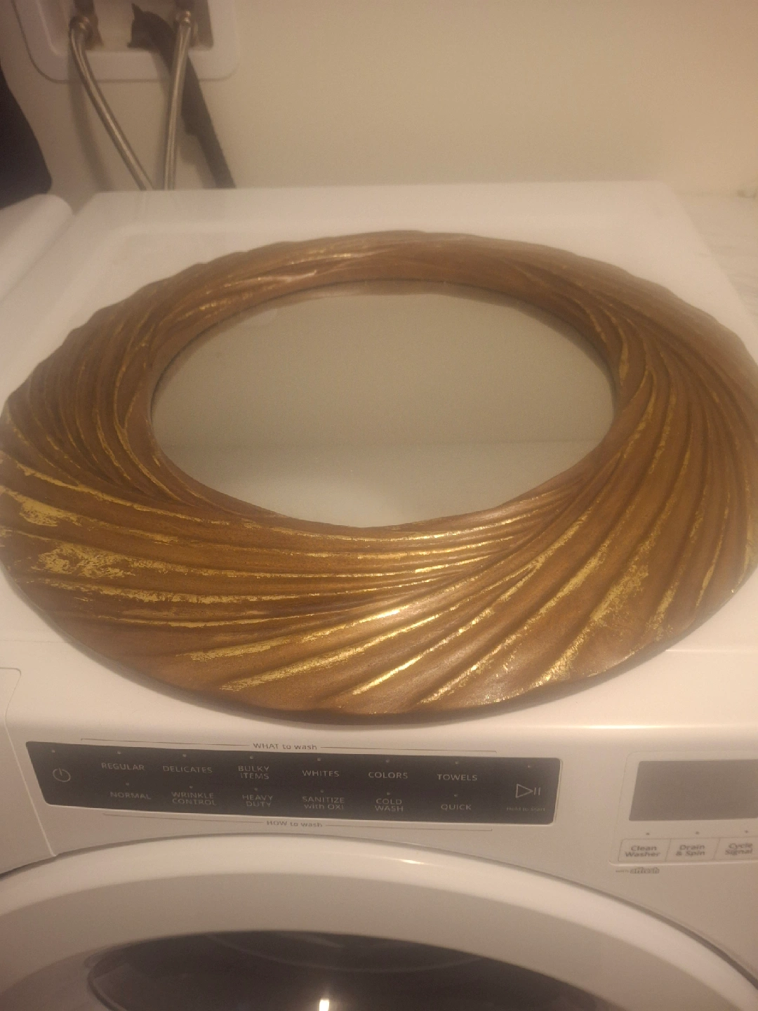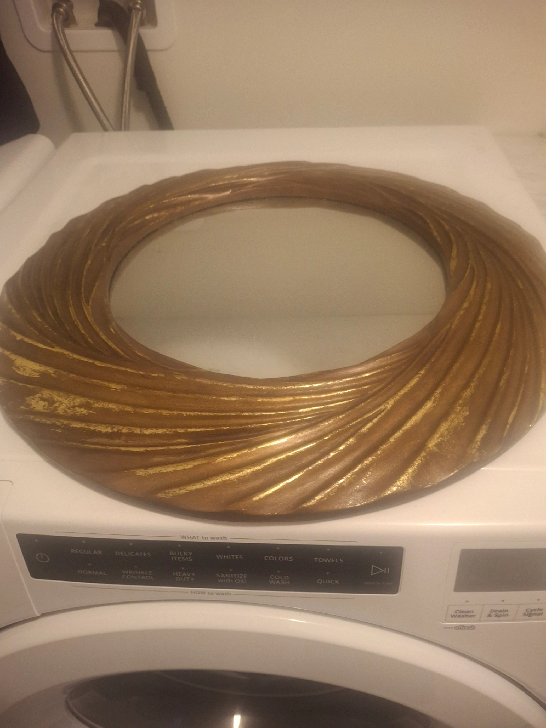 Selling a decorative round wall mirror with a unique gold finish. It's perfect for adding a touch of elegance to any room. The mirror is in great condition and ready to be hung up and enjoyed