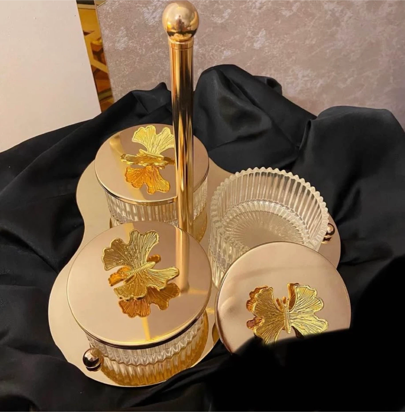 This is a beautiful gold decorative storage set. It includes three containers with lids and one open container, all arranged on a gold tray with a central handle. It's perfect for adding a touch of elegance to your home decor
