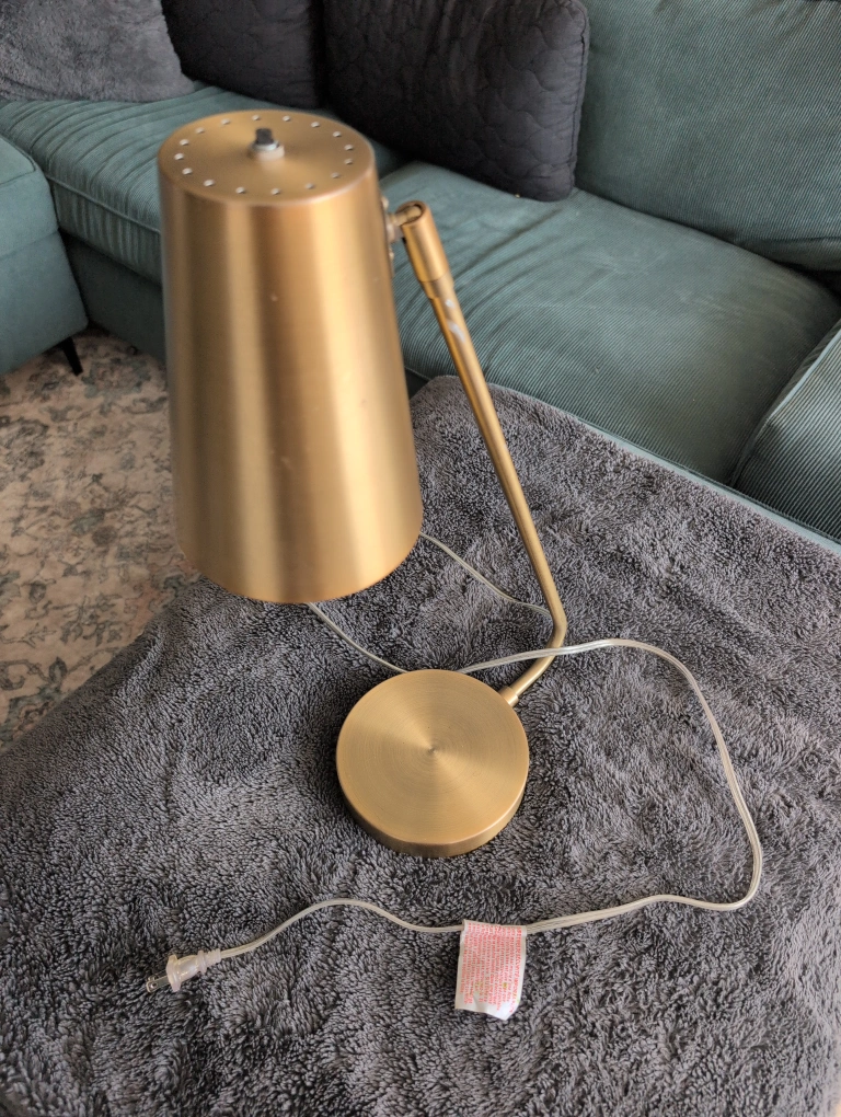 88Selling a stylish gold desk lamp! It's in great shape and would look lovely in any room. Perfect for adding a touch of elegance to your workspace or bedside table. It has a sleek design and provides a warm, inviting light. The top on /off switch is slightly broken but still works