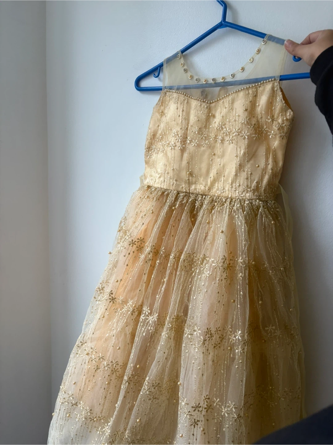 Selling a beautiful gold dress! It features delicate floral embroidery and pearl detailing. Perfect for a special occasion