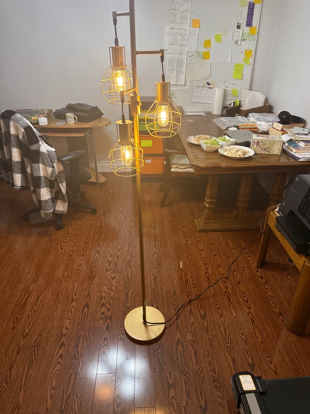 Selling a stylish gold floor lamp! It features a unique design with cage-style shades, adding a modern touch to any room. It's in great condition and provides a warm, inviting light.