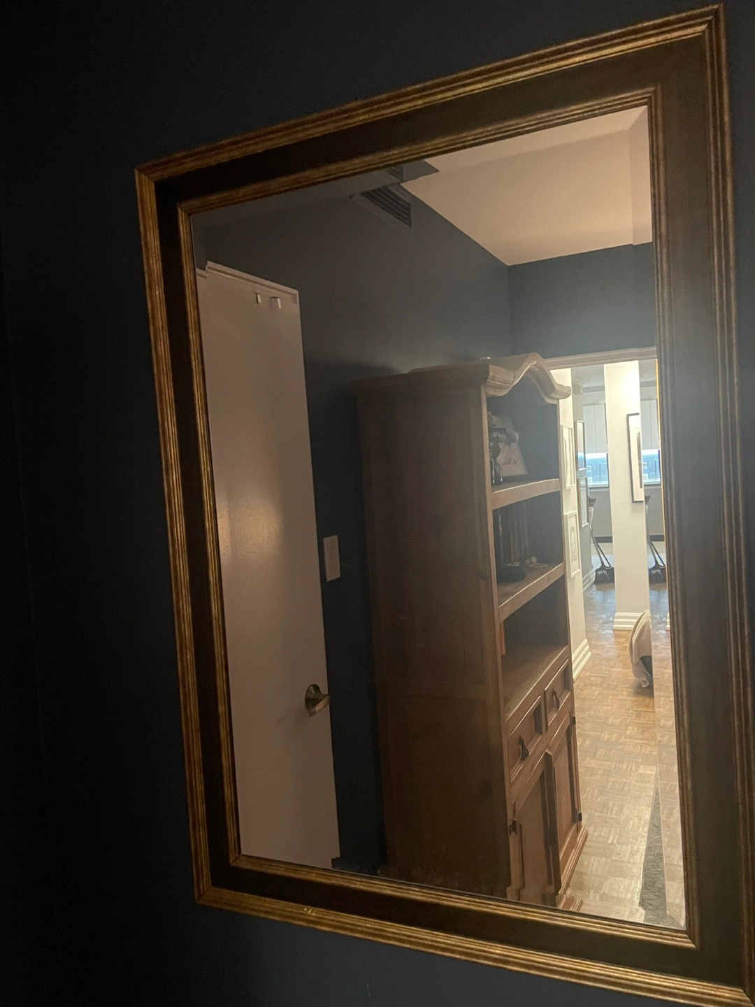 60Large rectangular mirror. Gold frame. Reflects a portion of a room.