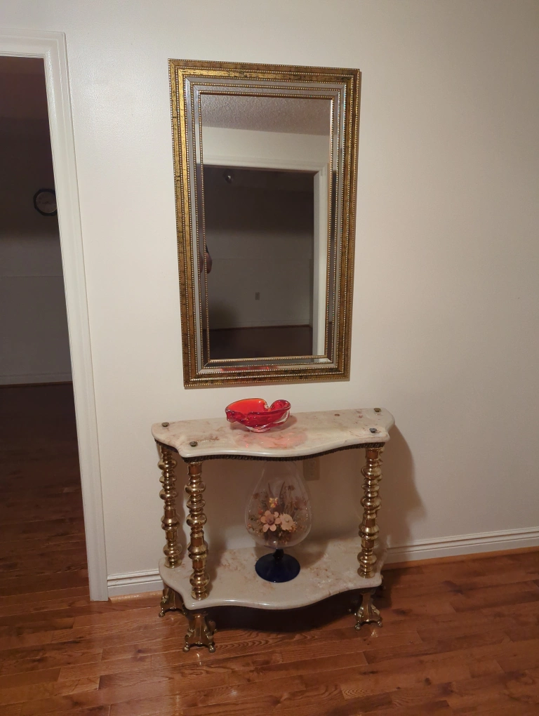 84Selling a beautiful gold-framed mirror and a marble-top console table. The mirror features an ornate gold frame, adding a touch of elegance to any room. The console table has a marble top and gold accents, perfect for an entryway or living room. Both pieces are in great condition and ready to enhance your home decor!