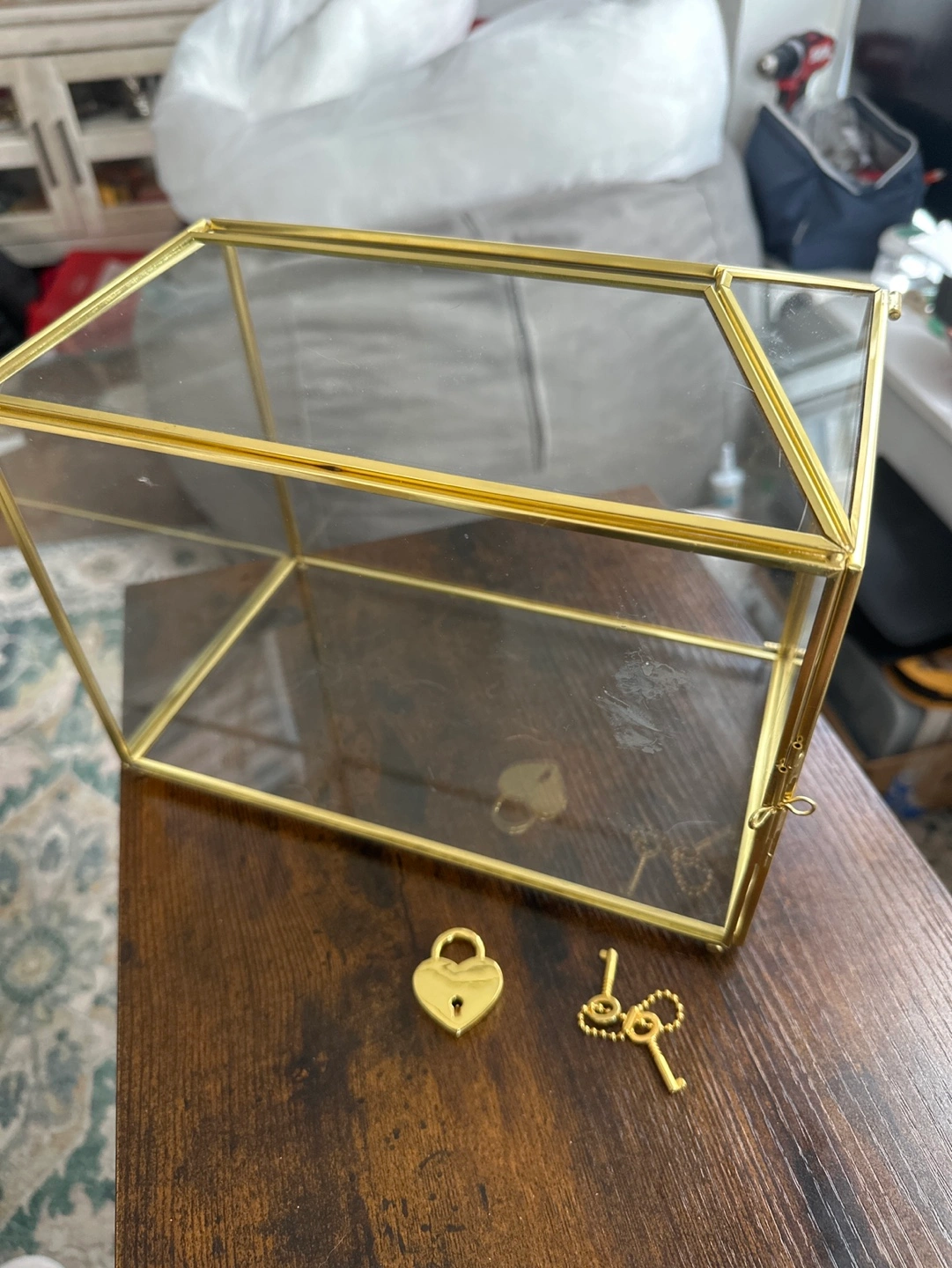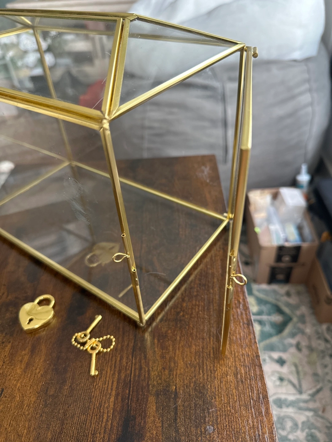 95Glass display case with gold metal frame. Features a heart-shaped padlock and two keys. Perfect for displaying small items like jewelry or models. Also good for collecting cards, gifts, envelopes at events. Perfect for mini greenhouse projects too