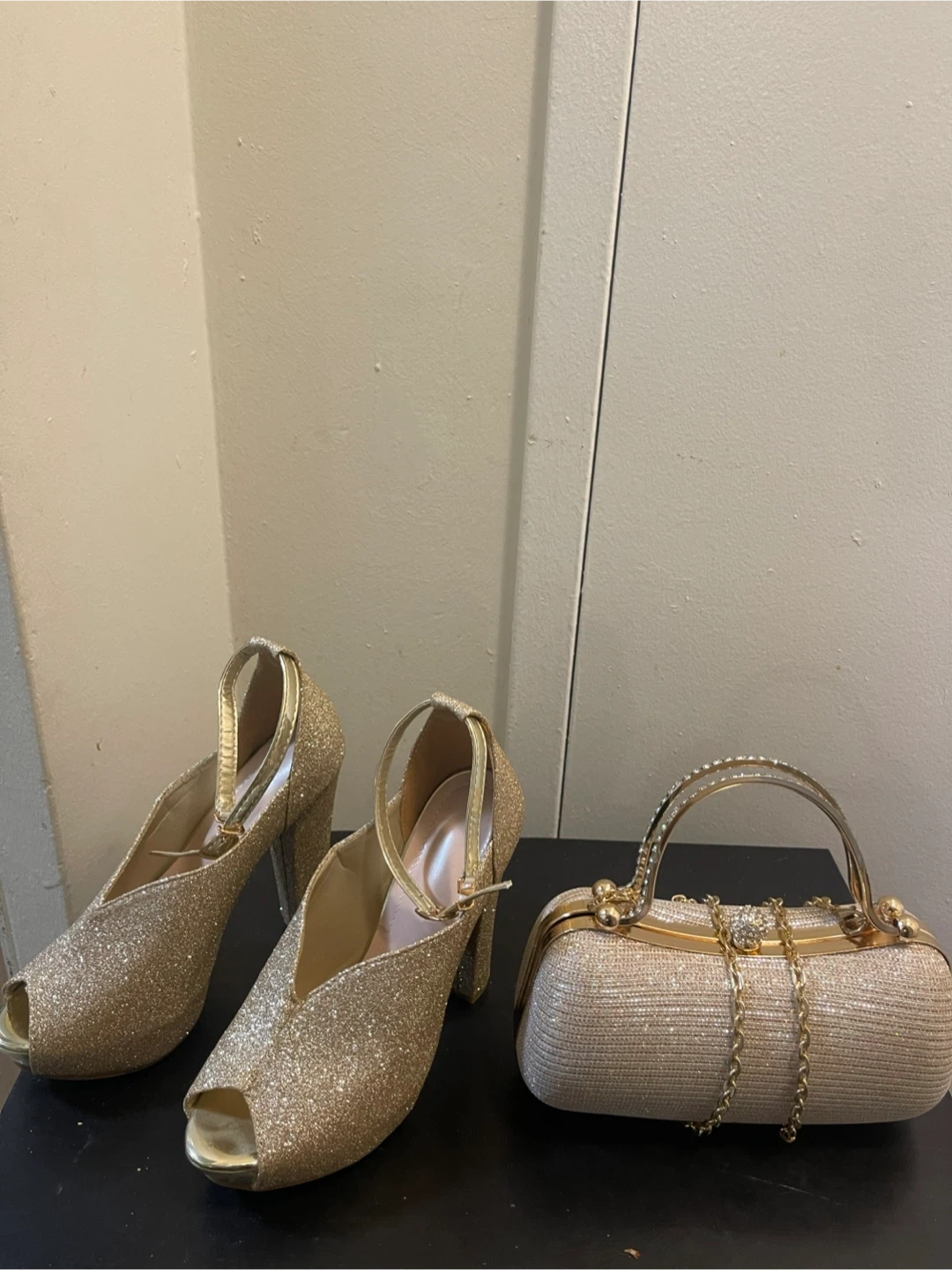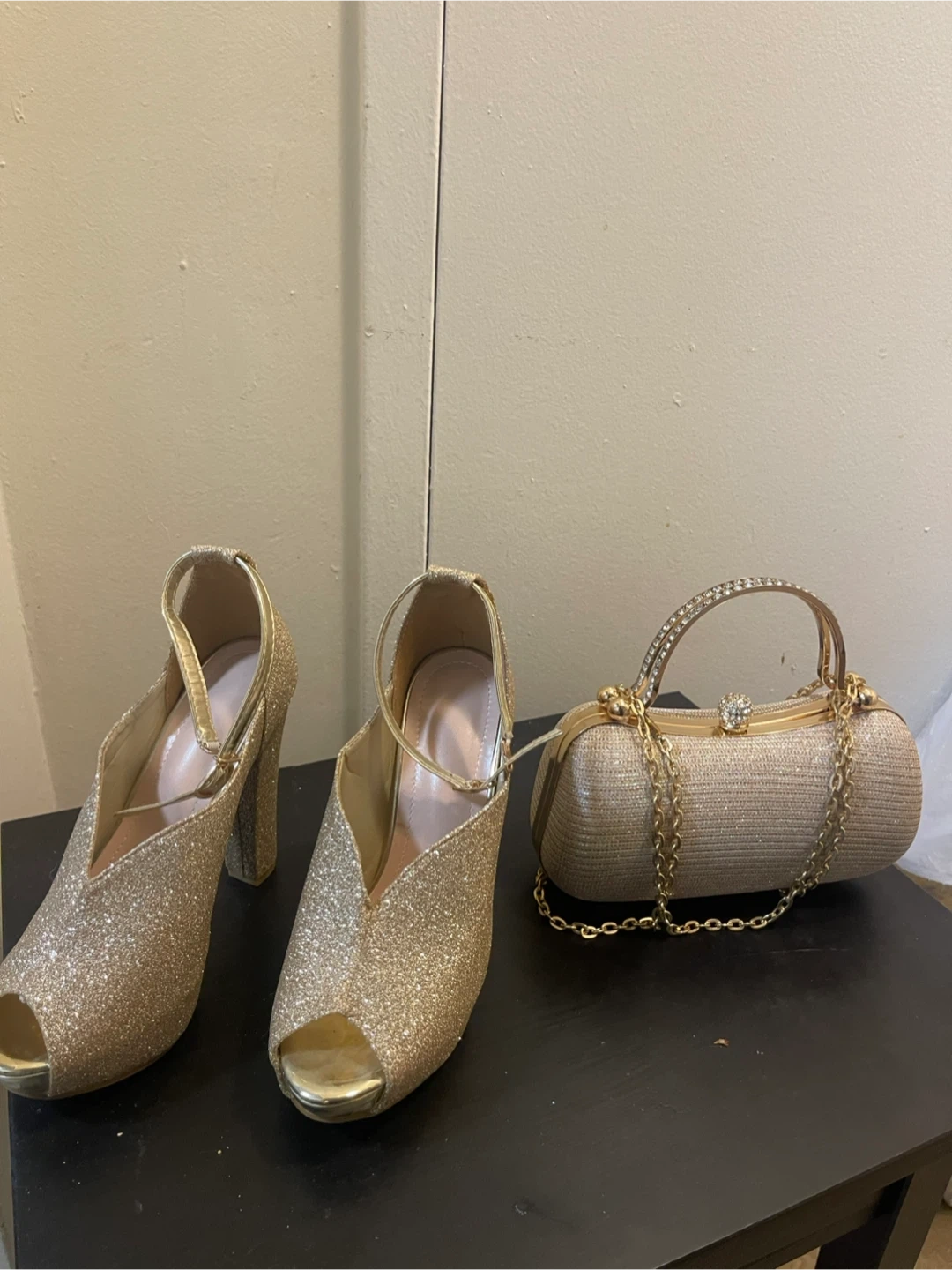 Selling a matching set of gold glitter heels and a clutch. Perfect for a night out or special occasion. The heels have a peep-toe design and the clutch has a chain strap. They are in good condition and ready for a new home