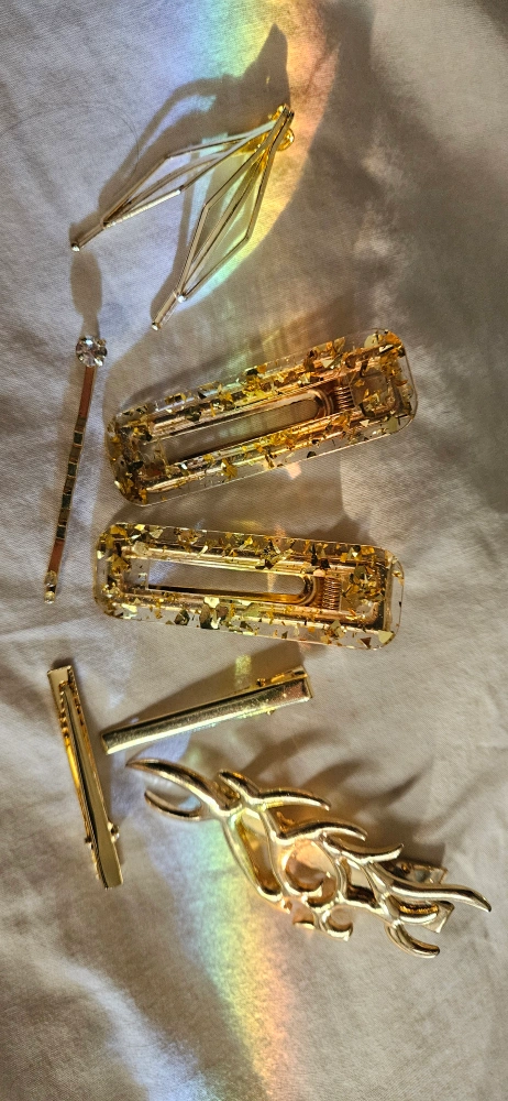 Selling a set of gold-toned hair clips! Includes a variety of styles, from simple bobby pins to decorative statement pieces. Adds a touch of sparkle to any hairstyle