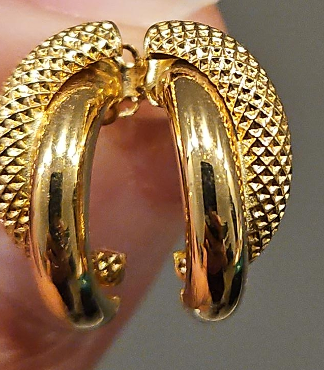 Selling a pair of 18K gold hoop earrings. They have a textured design on the top half. This was bought in Jeddah, Saudi Arabia. Perfect for adding a touch of elegance to any outfit