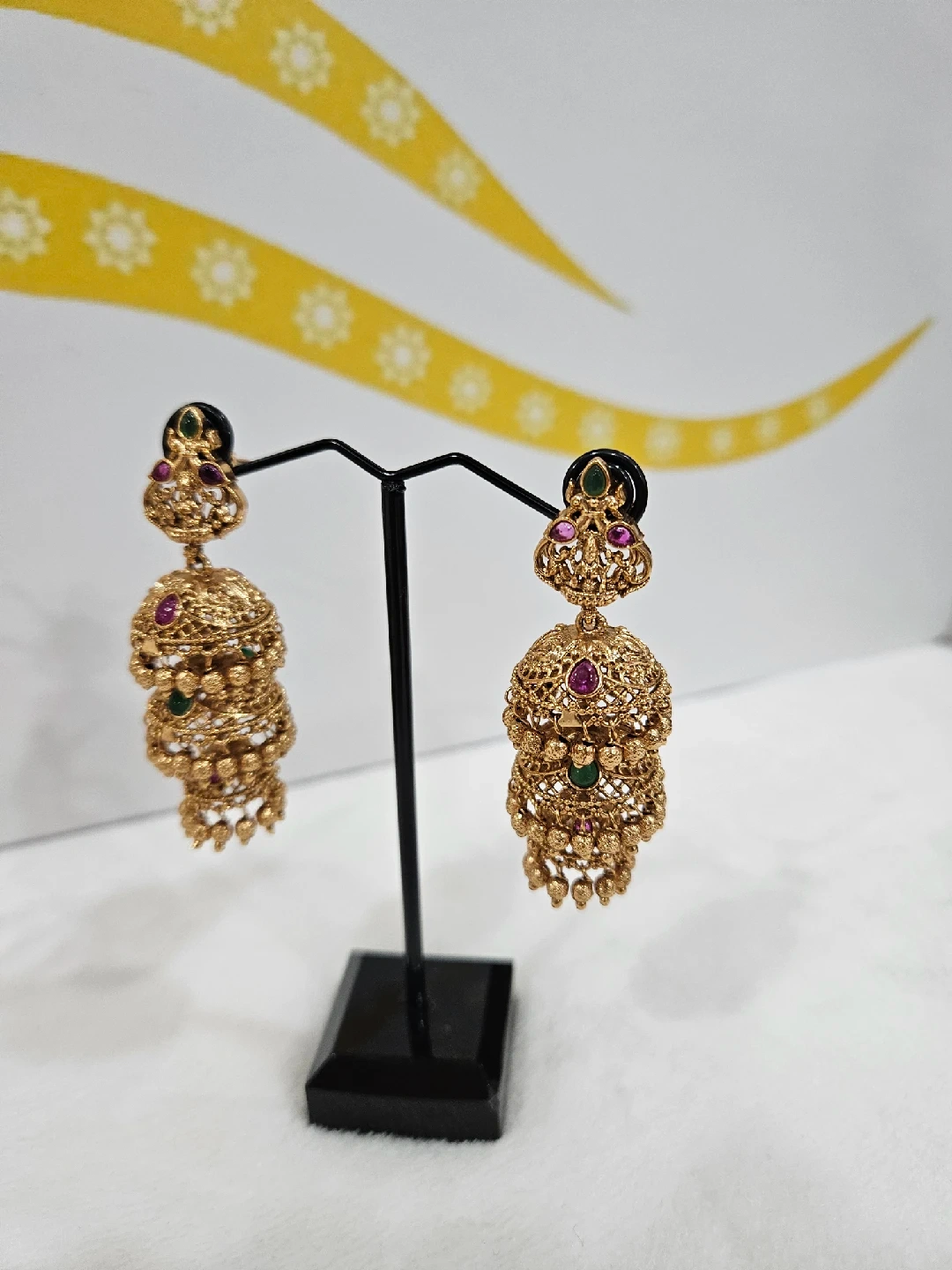 10Selling a pair of beautiful gold jhumka earrings. They feature intricate detailing and small coloured stones.