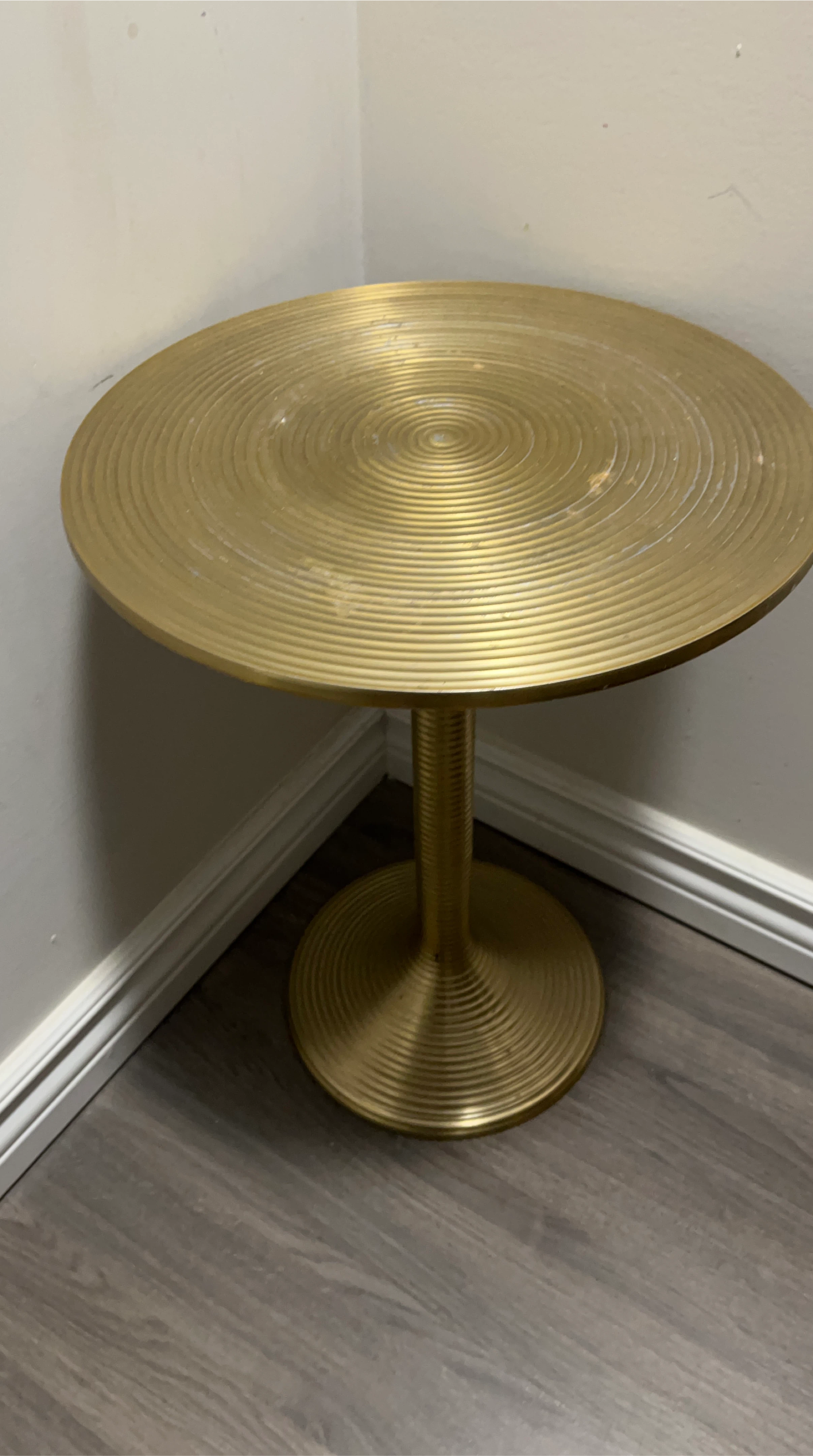 Selling a cute gold metal accent table! It has a unique rippled design on the top and base. There are some minor signs of wear on the surface, but overall it's in good condition and ready to add a touch of glam to your space