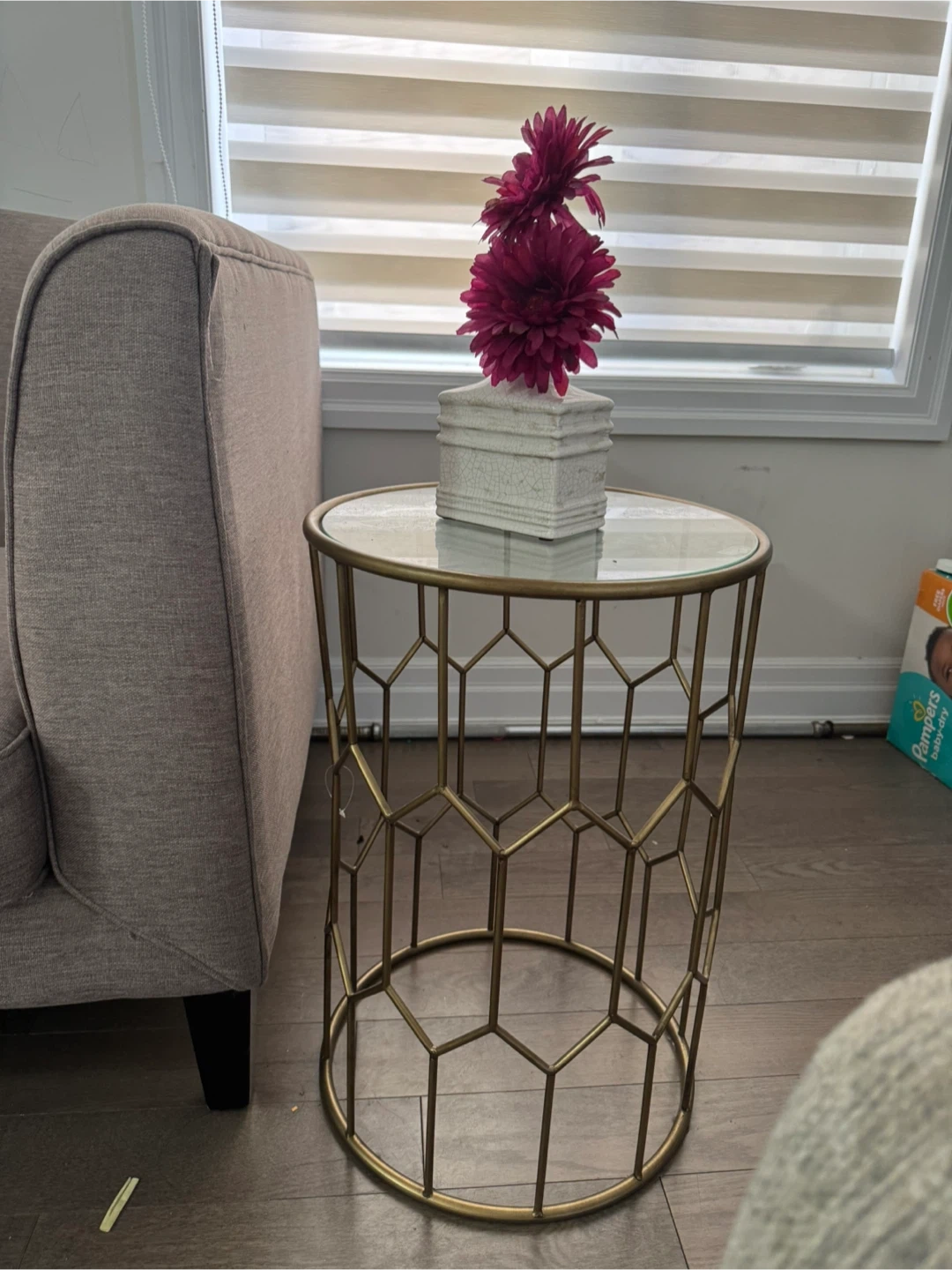 Selling two lovely gold metal accent table with a glass top! It's in great condition and would be a stylish addition to any room. Perfect for displaying plants or holding your favourite books! I have two for $35 each