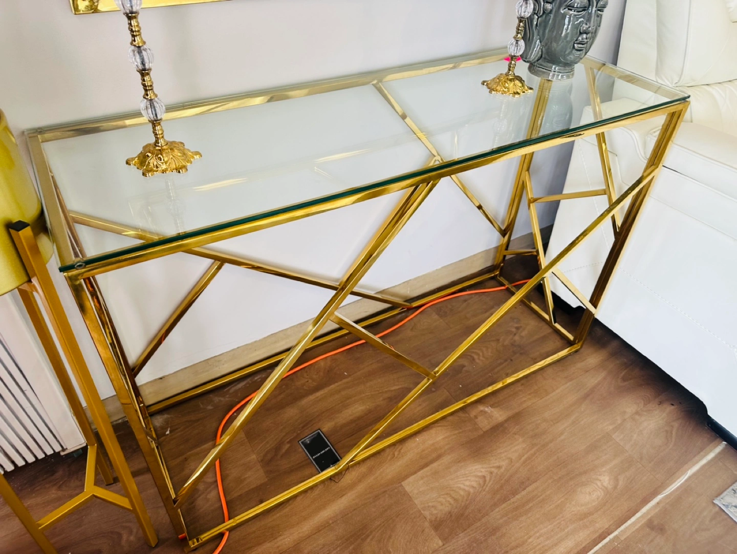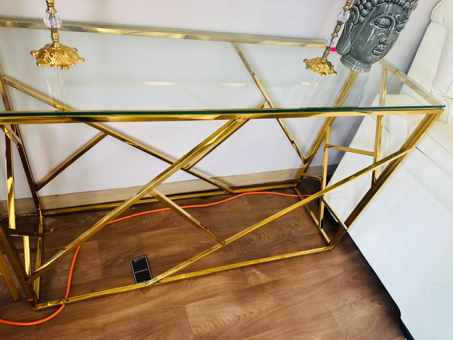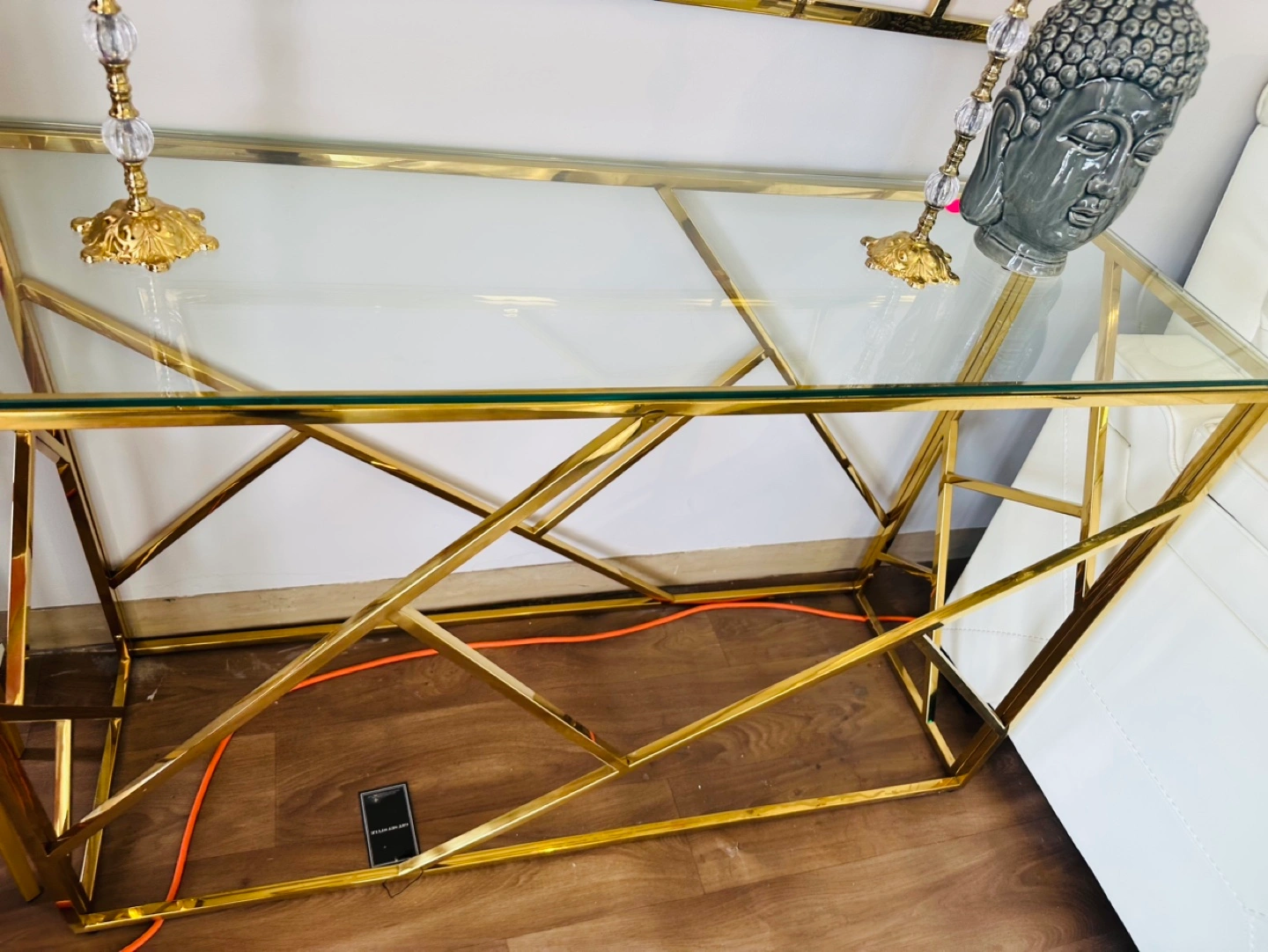 Elegant console table. Gold metal frame. Glass top. Geometric design. Adds a touch of glamour to any room.
