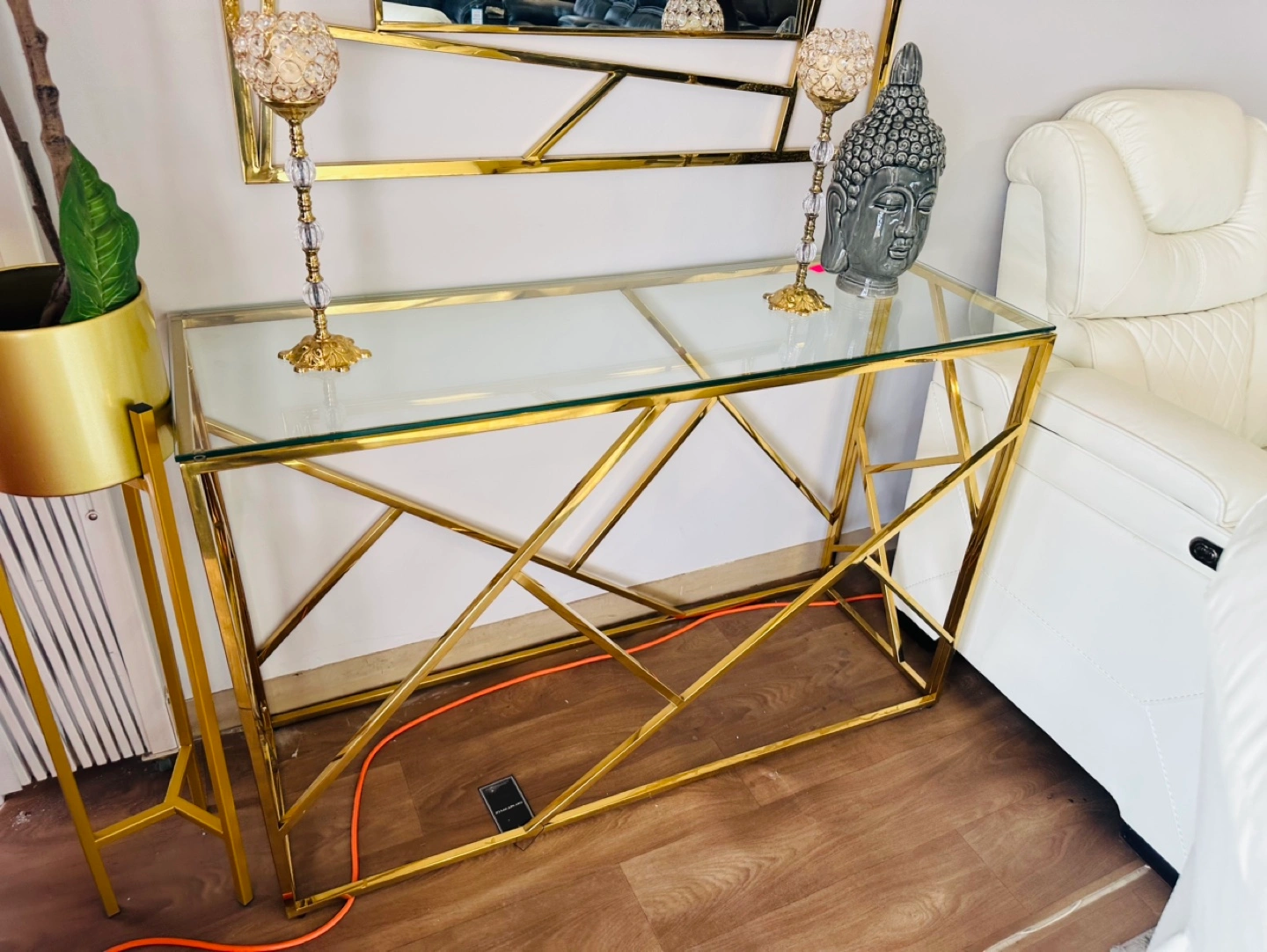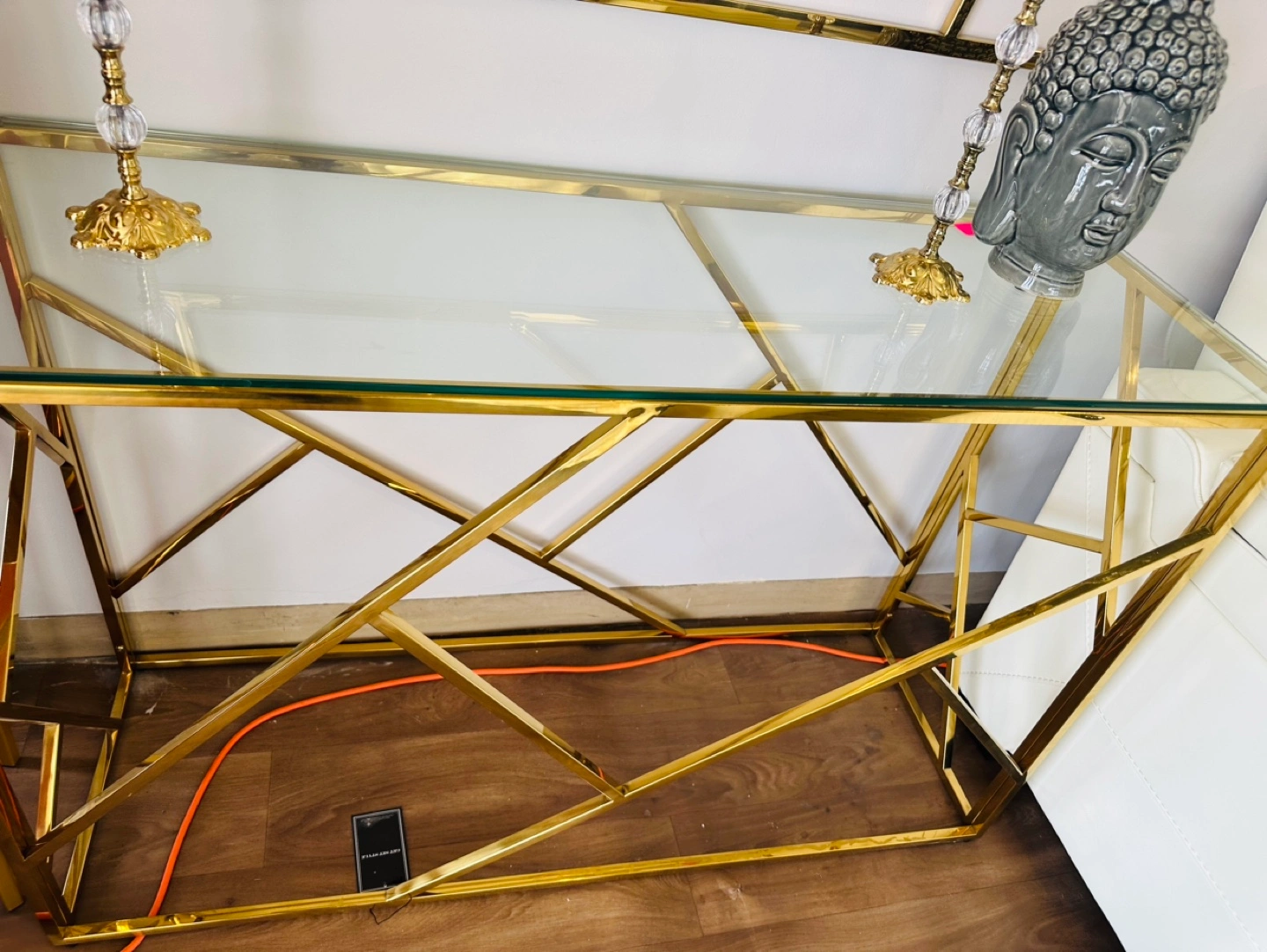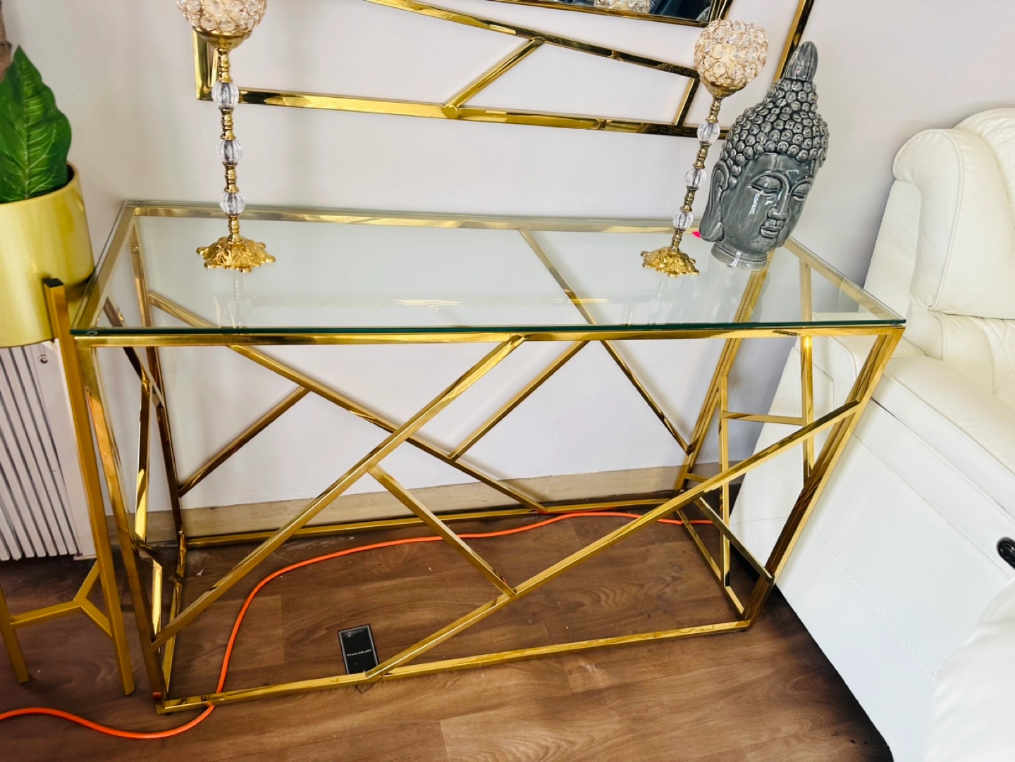 Elegant console table. Gold metal frame. Glass top. Geometric design. Adds a touch of glamour to any room.