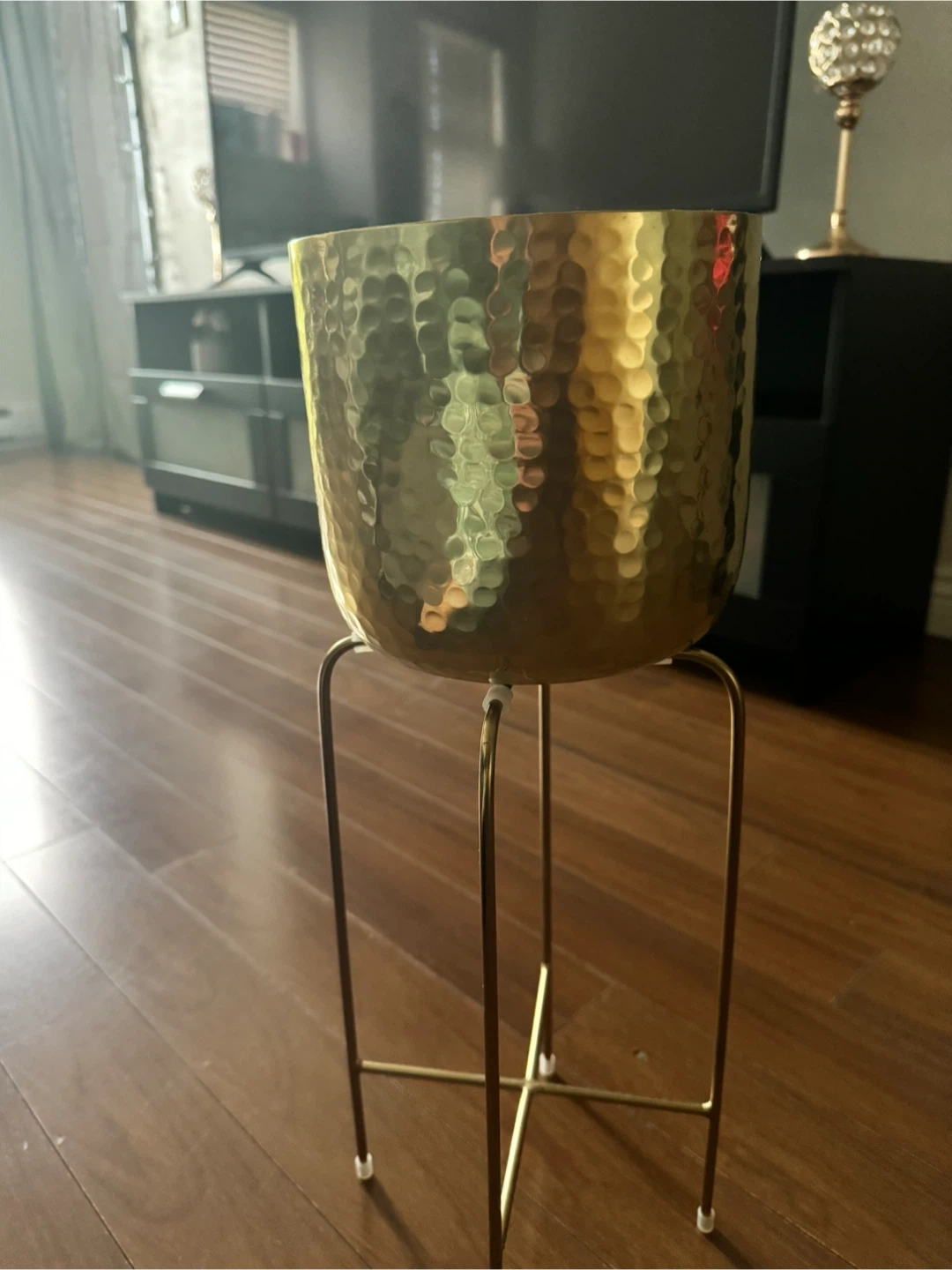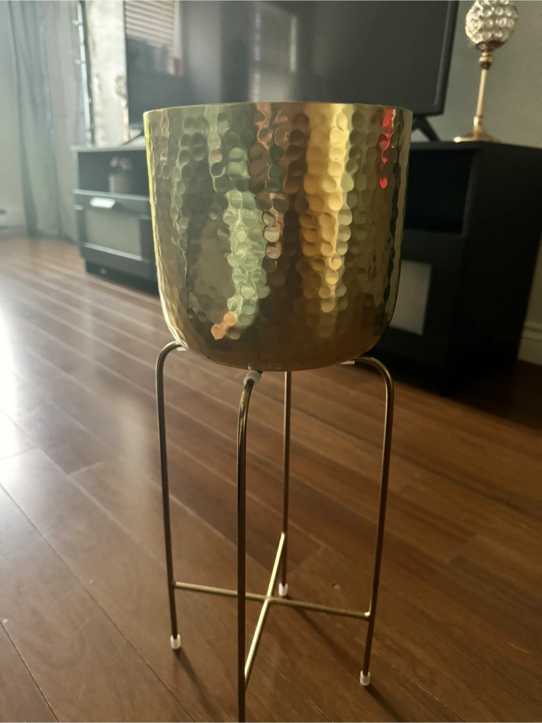 Selling a gold metal plant pot with a stand! It's in great condition and would look lovely in any home. Flowers or plants pot (appprox 20cm). Also selling pebbles along with it. Open for negotiation