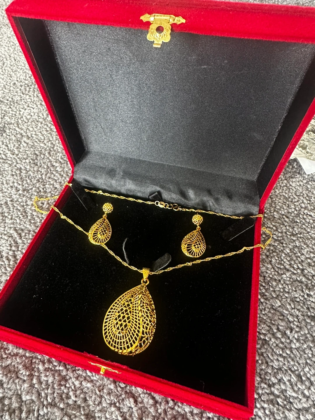 10Selling a beautiful gold necklace and earring set. It comes in a red velvet box, perfect for gifting or keeping it safe. The set features a delicate chain and teardrop pendant with matching earrings. A lovely addition to any jewellery collection!
