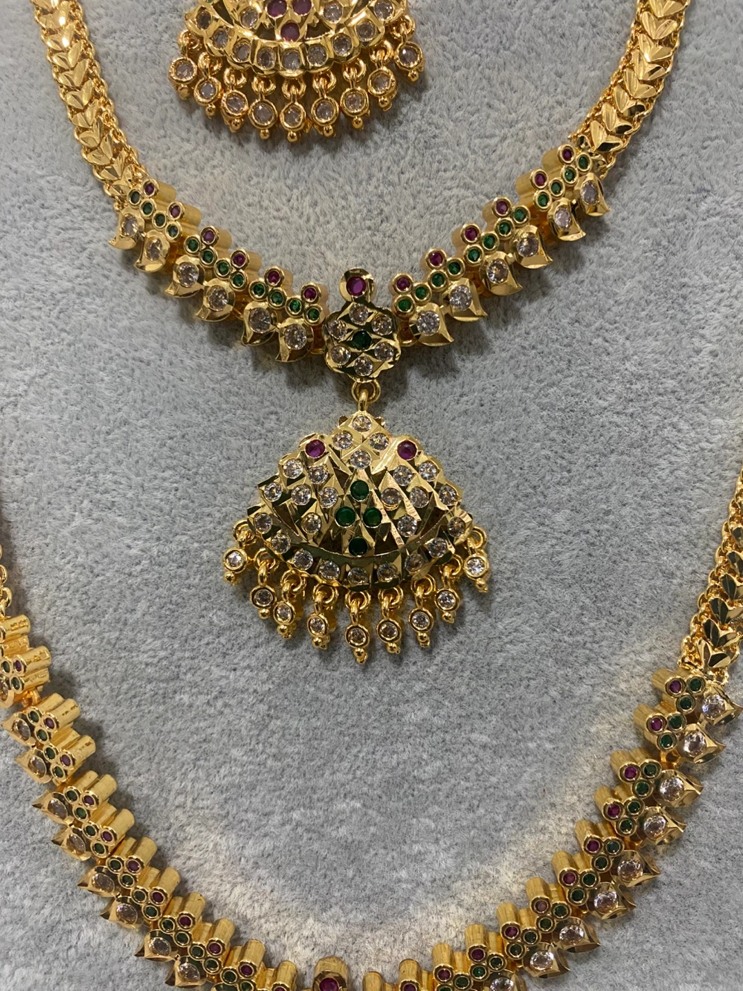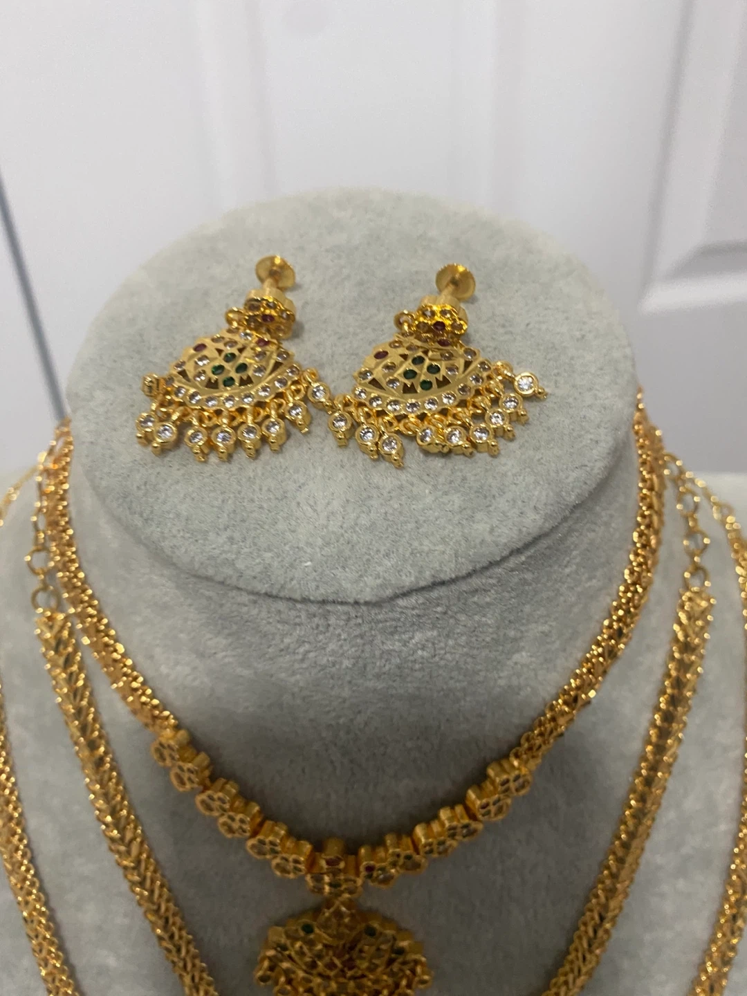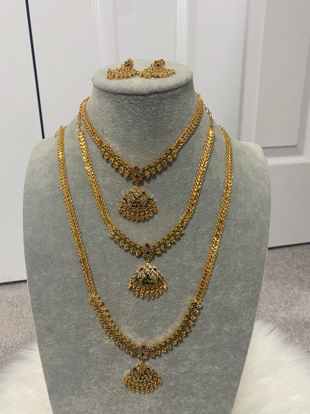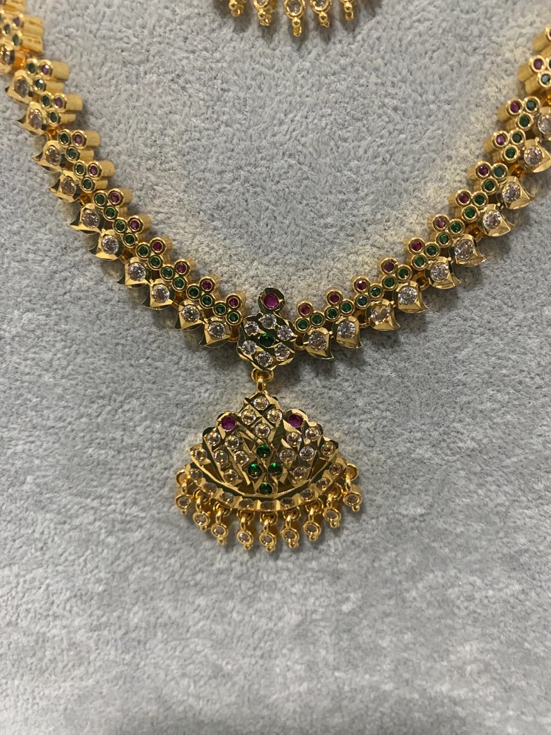 28Beautiful gold plated necklace and earring set. The set includes a necklace with a pendant and matching earrings. The jewelry features small stones in red, green, and white.