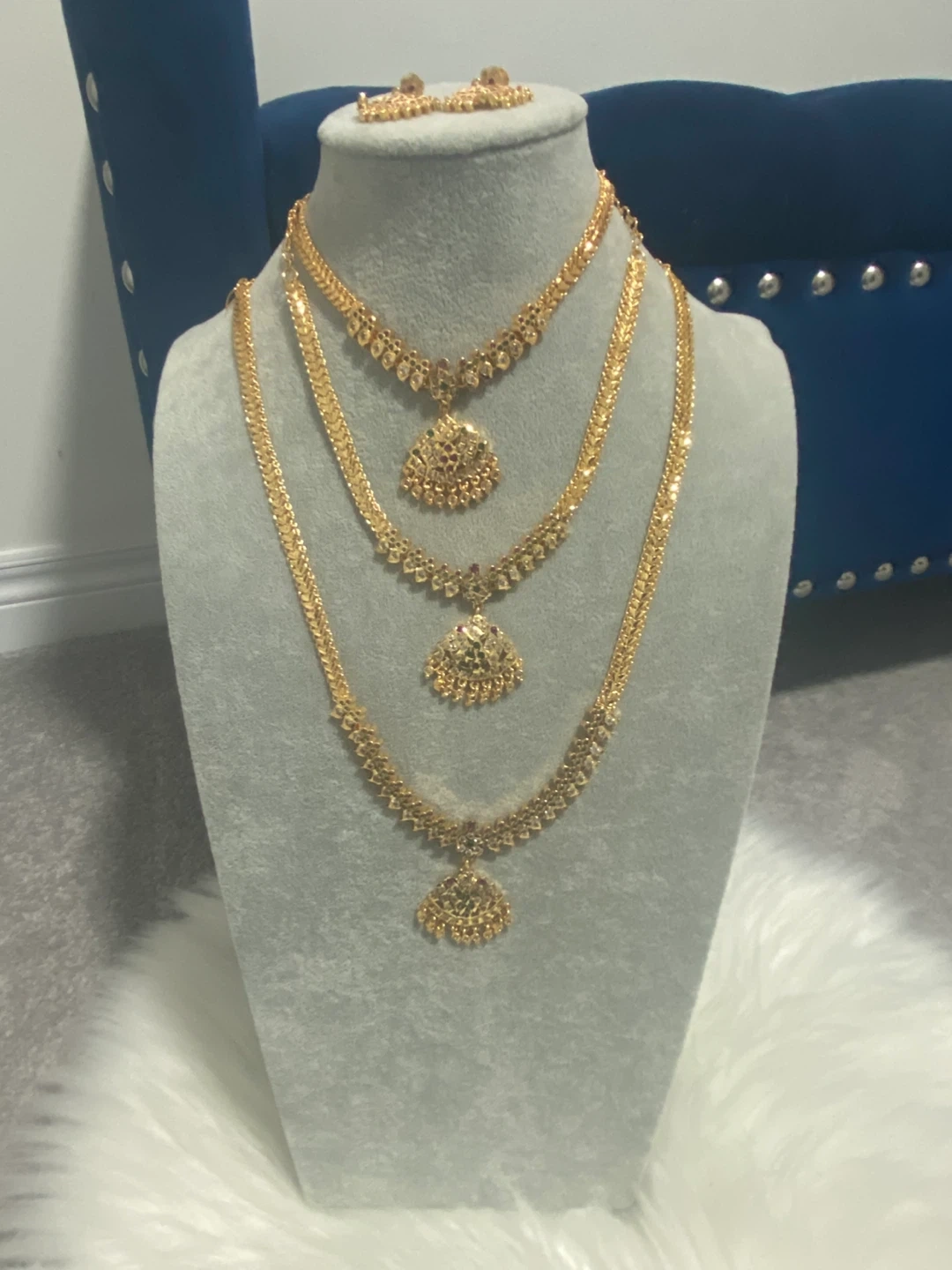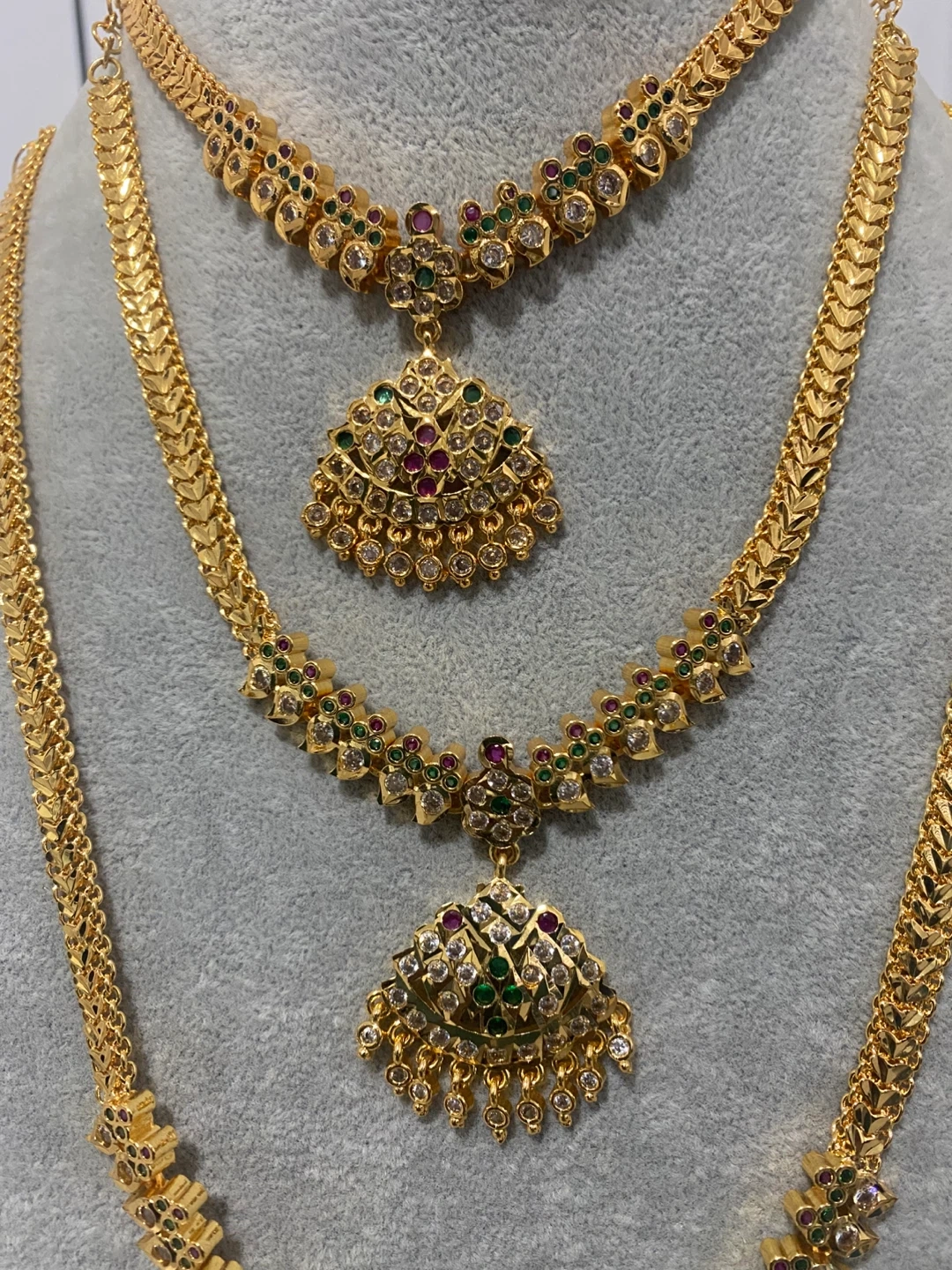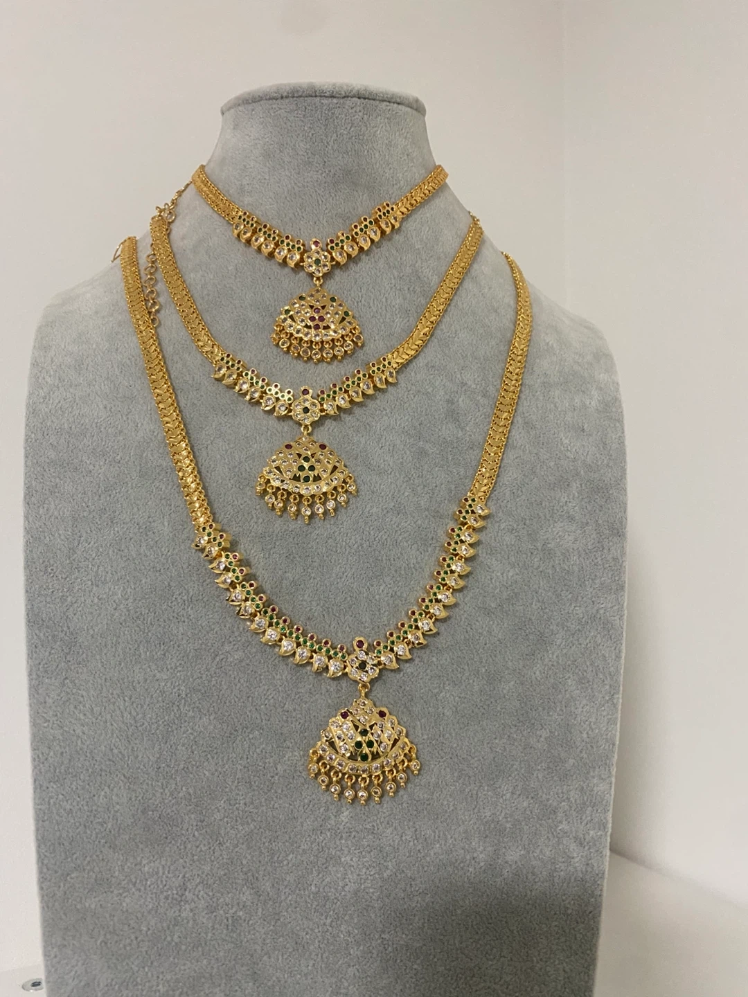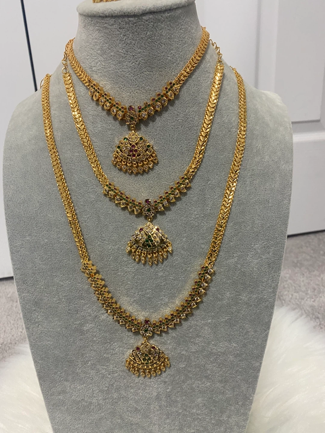 28Beautiful gold plated necklace and earring set. The set includes a necklace with a pendant and matching earrings. The jewelry features small stones in red, green, and white.