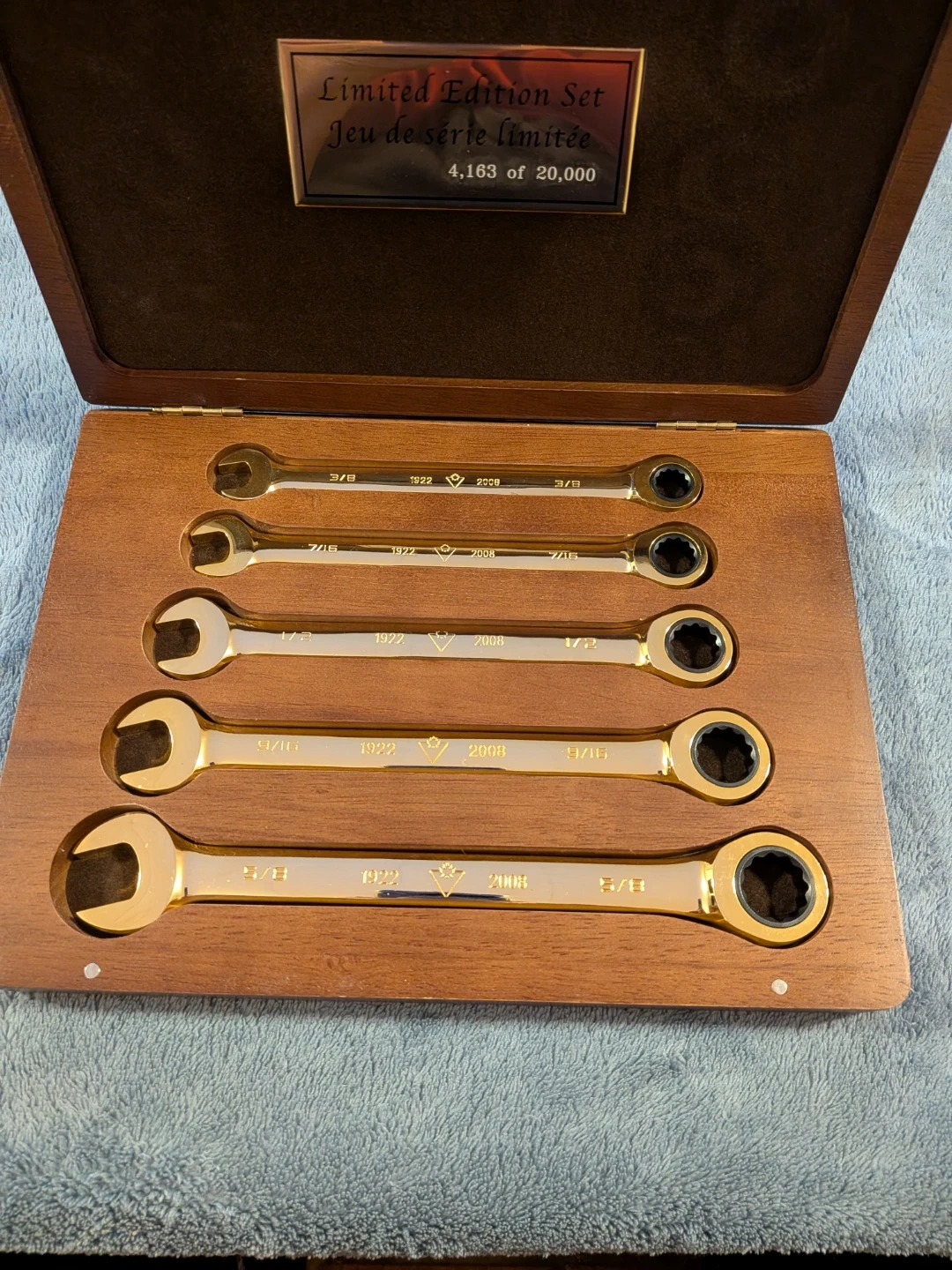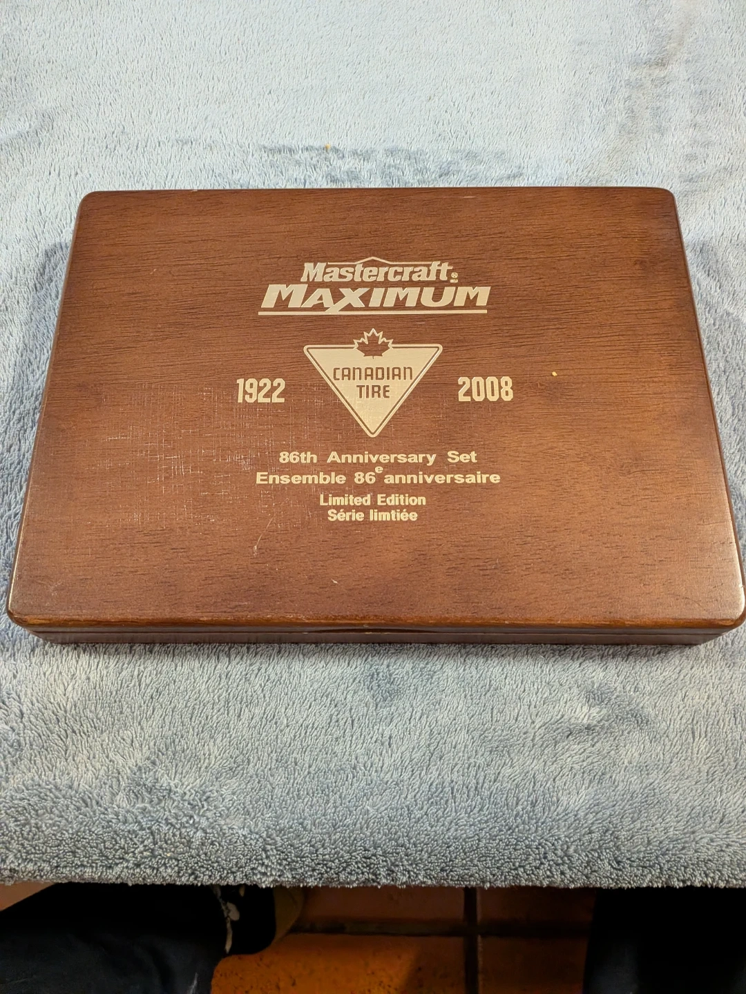 60Selling a Mastercraft Maximum 86th Anniversary Limited Edition Wrench Set. This set is number 4,163 of 20,000. It commemorates the 86th anniversary of Canadian Tire, from 1922 to 2008. The wrench set comes in a wooden box.Never used.