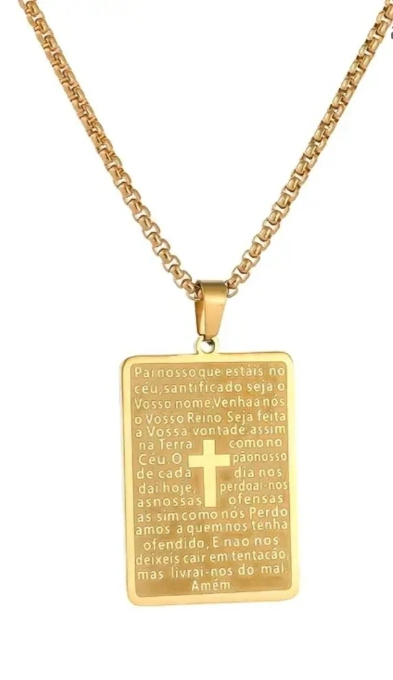 65This is a gold-tone necklace with a rectangular pendant. The pendant has religious text and a cross symbol on it. The chain is a box-style chain. Please Check out my other listings