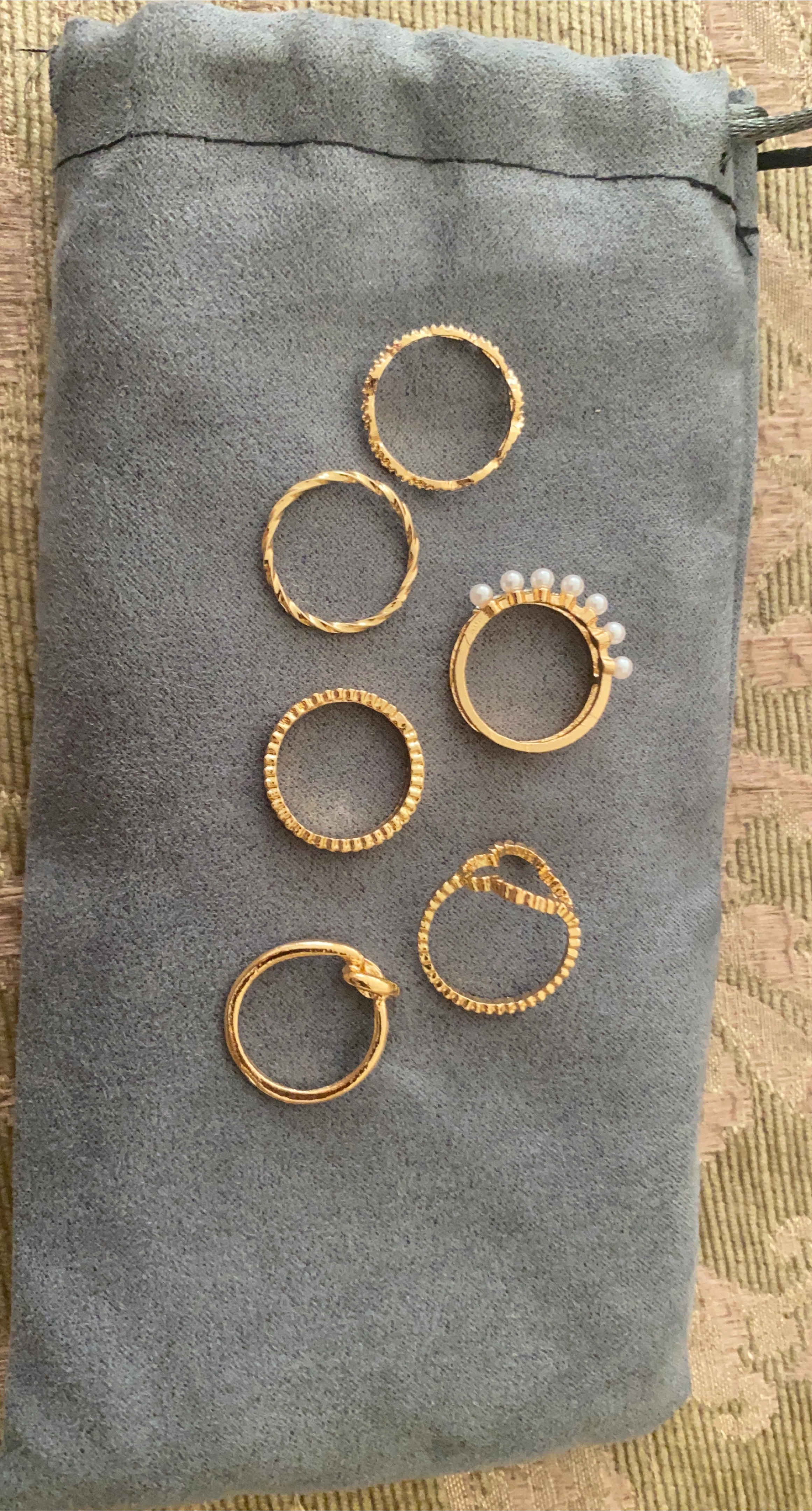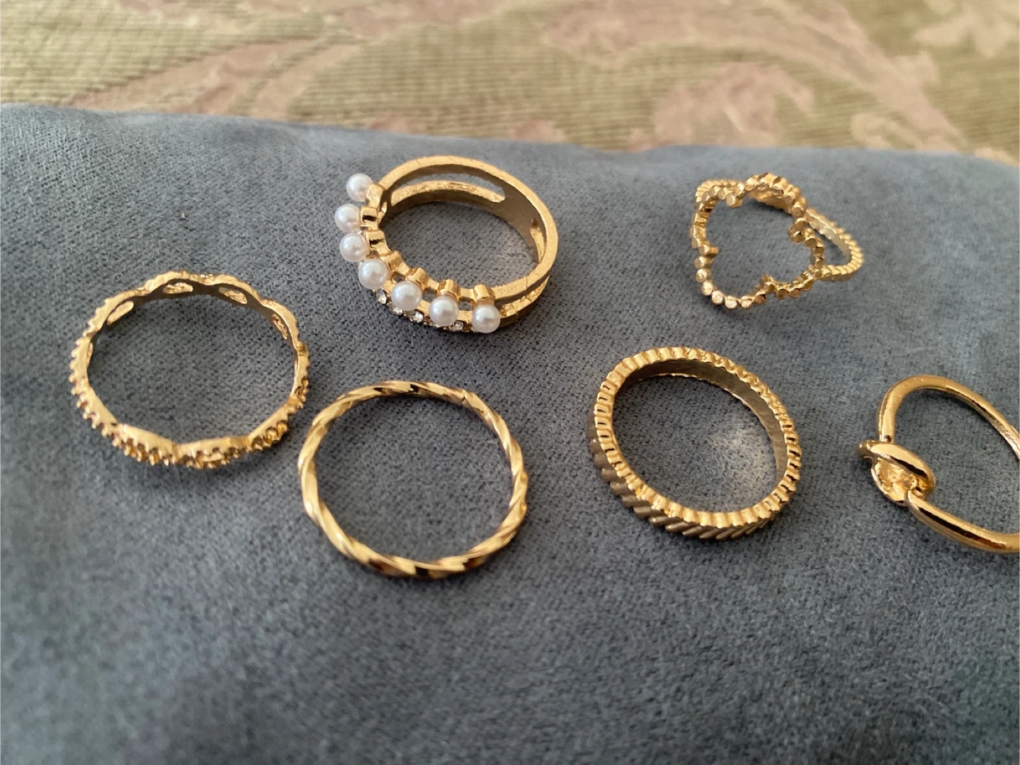 Selling a set of gold plated rings. There are 6 rings in total, each with a different style. They are in great condition actually new and not used, and would make a lovely addition to any jewellery collection! Best price for such a great jewellery!