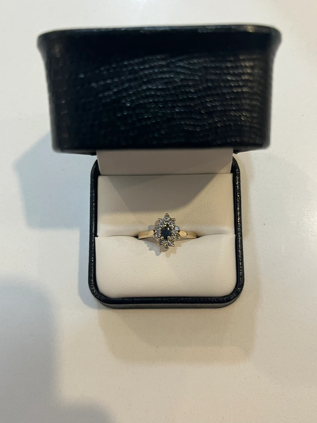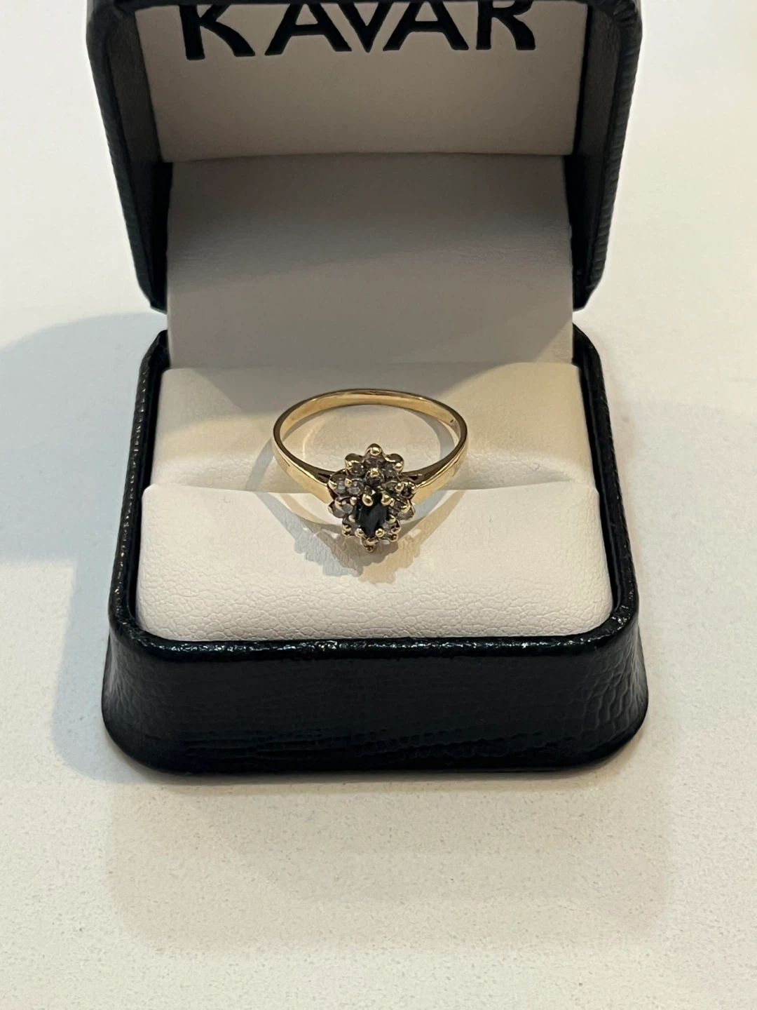 Selling a beautiful Kavar gold ring featuring a striking black stone surrounded by smaller stones. It comes in its original box, making it perfect as a gift or a special treat for yourself!