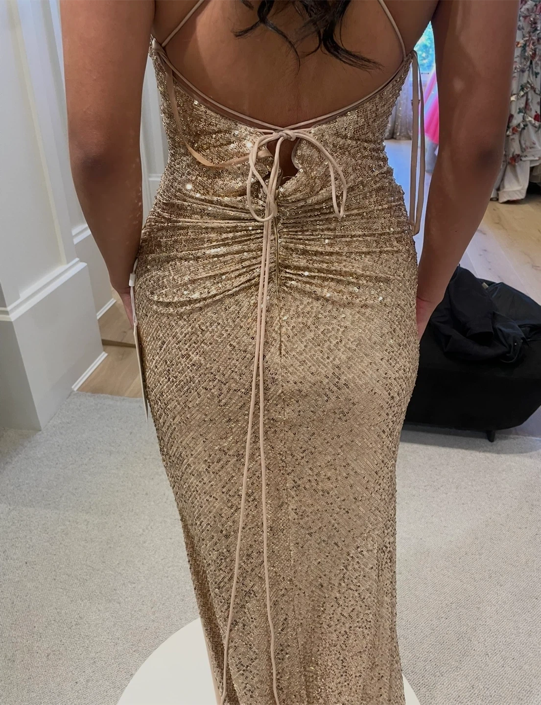 65Worn for 2024 Prom season only worn once Smaller but adjustable size Bought for 375 but price negotiable No adjustments were made to this dress it’s as is it was bought - still has its train.