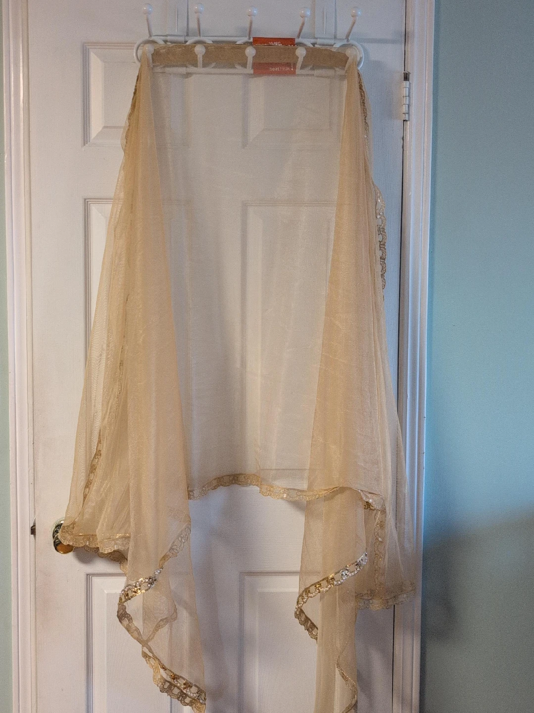 87Selling a beautiful gold dupatta with sequin trim! It's perfect for adding a touch of elegance to any outfit. The delicate fabric drapes nicely and the sequin detailing catches the light beautifully