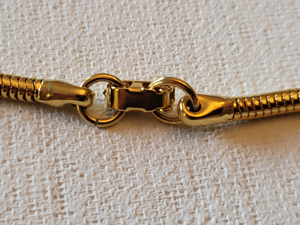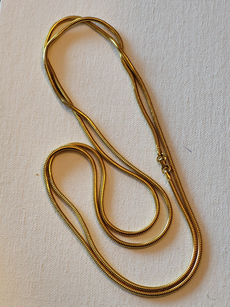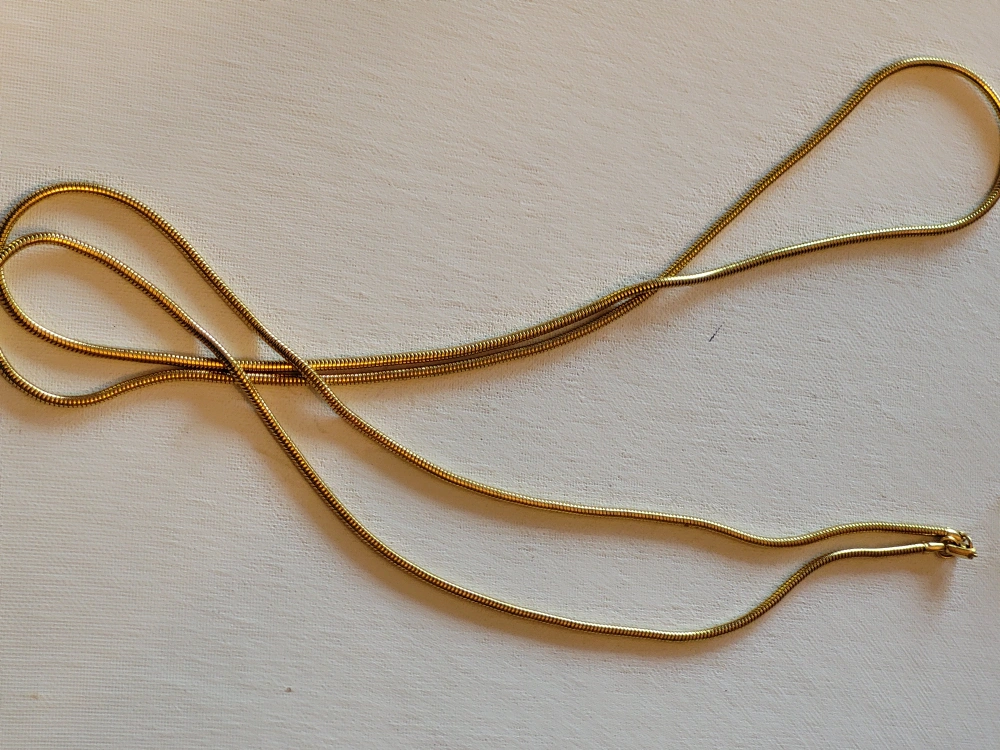 Selling a lovely gold snake chain necklace. It's in great condition and ready to add a touch of elegance to any outfit! 50"