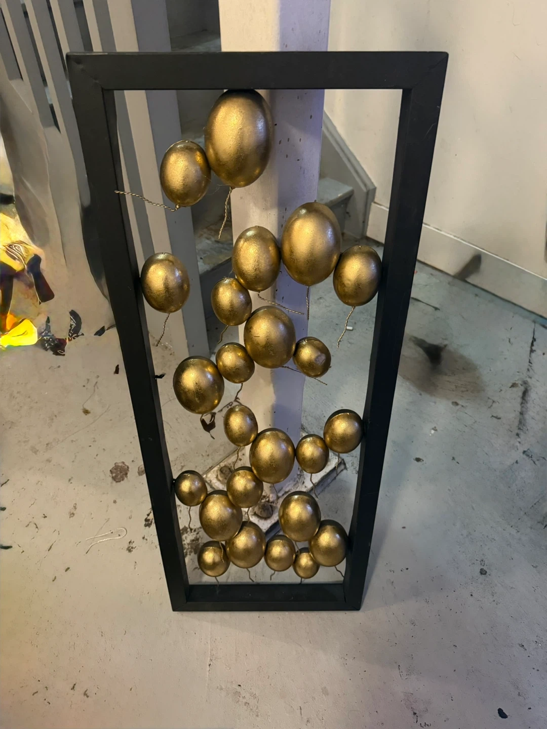 IKEA Unique wall art featuring gold spheres within a black frame. It's in great condition and ready to add a touch of modern elegance to your home decor!