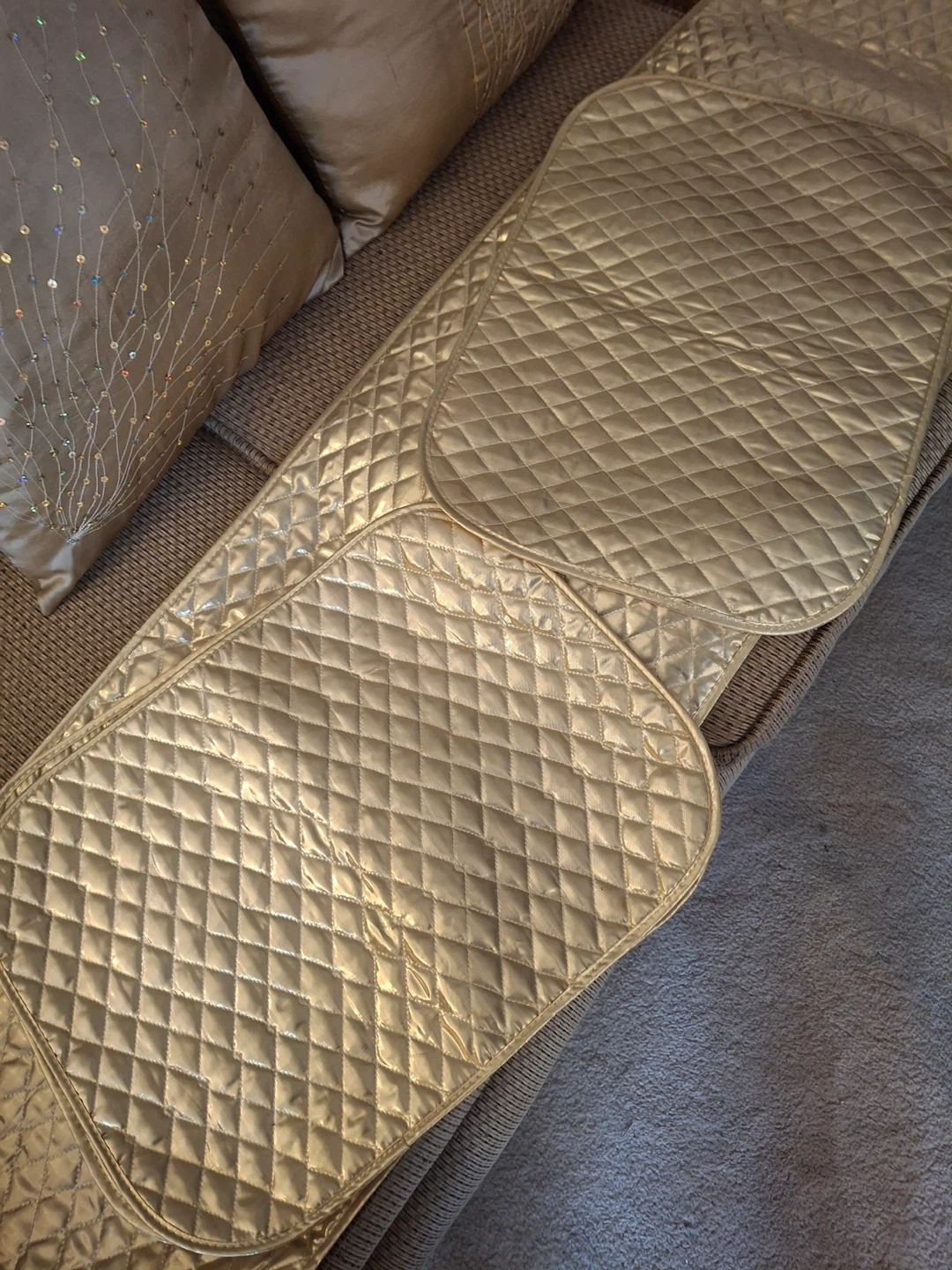 1000+Long quilted table runner in gold colour. Comes with 2 gold placemats. Runner is 69” by 14”. Never been used. Perfect for a holiday table! Available for pickup in Markland Wood.