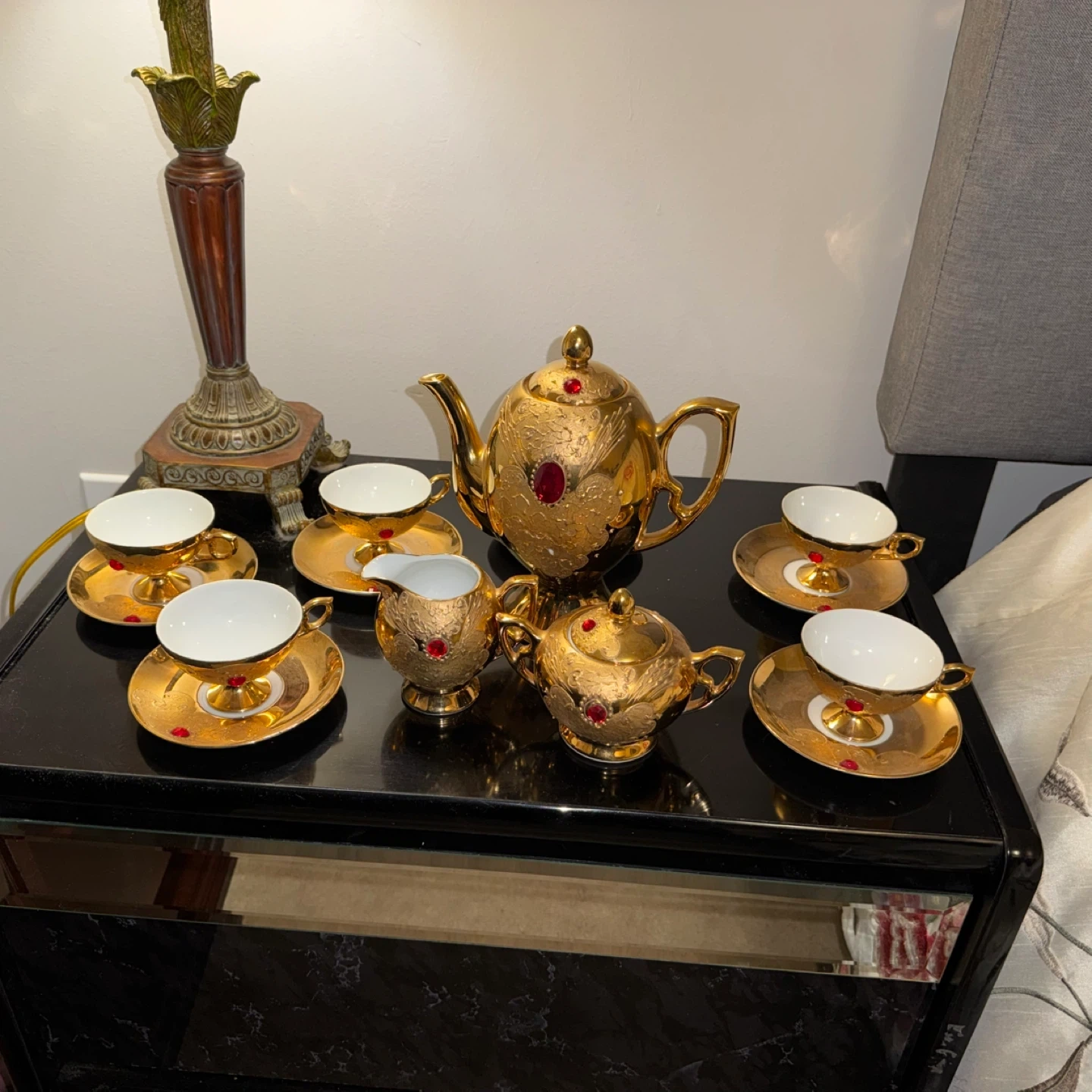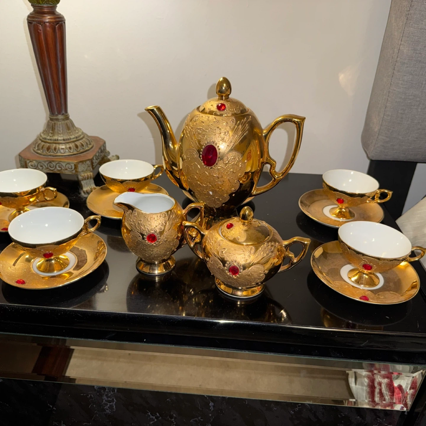 65Beautiful gold tea set, perfect for adding a touch of elegance to your tea time! Includes a teapot, sugar bowl, creamer, and six teacups with saucers. The set is accented with lovely ruby-like details.