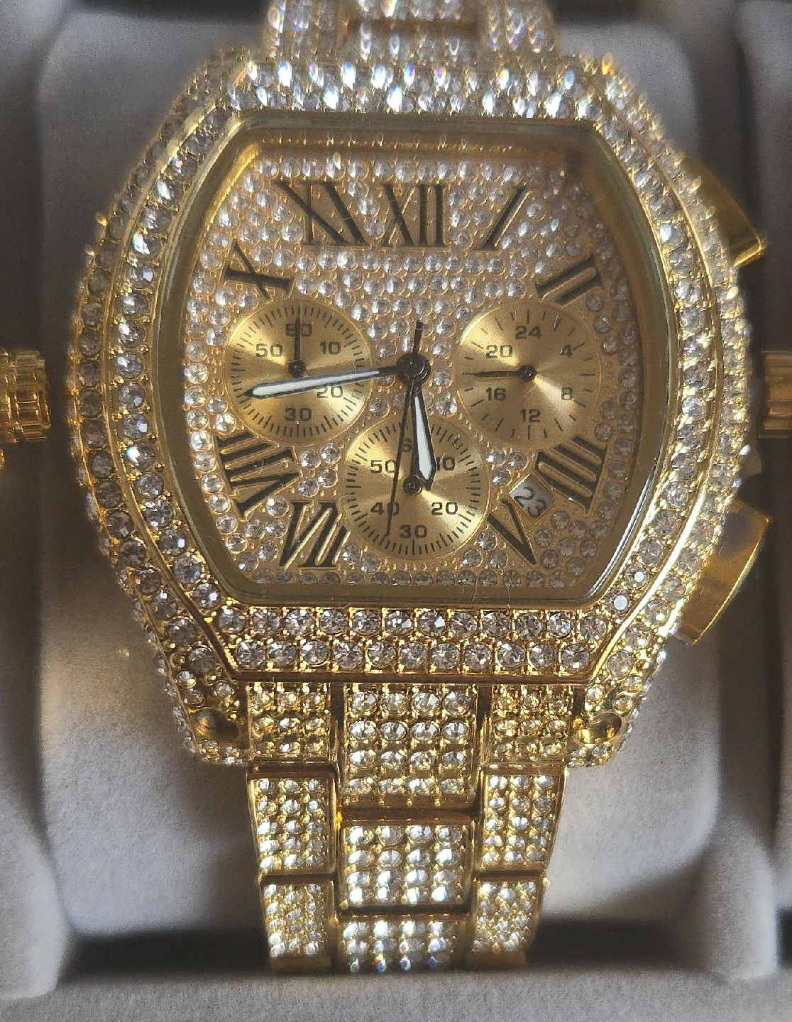 10Selling a gold-tone chronograph watch! It features Roman numerals and is adorned with many crystals. A very shiny and eye-catching piece!