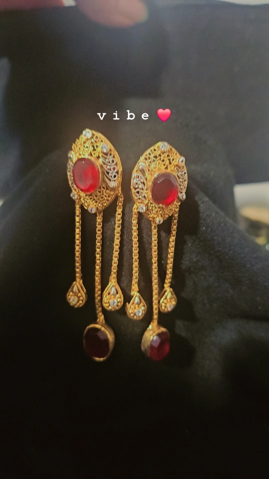 These are a pair of dull gold-tone dangle earrings. They feature a filigree design and red stones. They're perfect for adding a touch of elegance to any outfit!