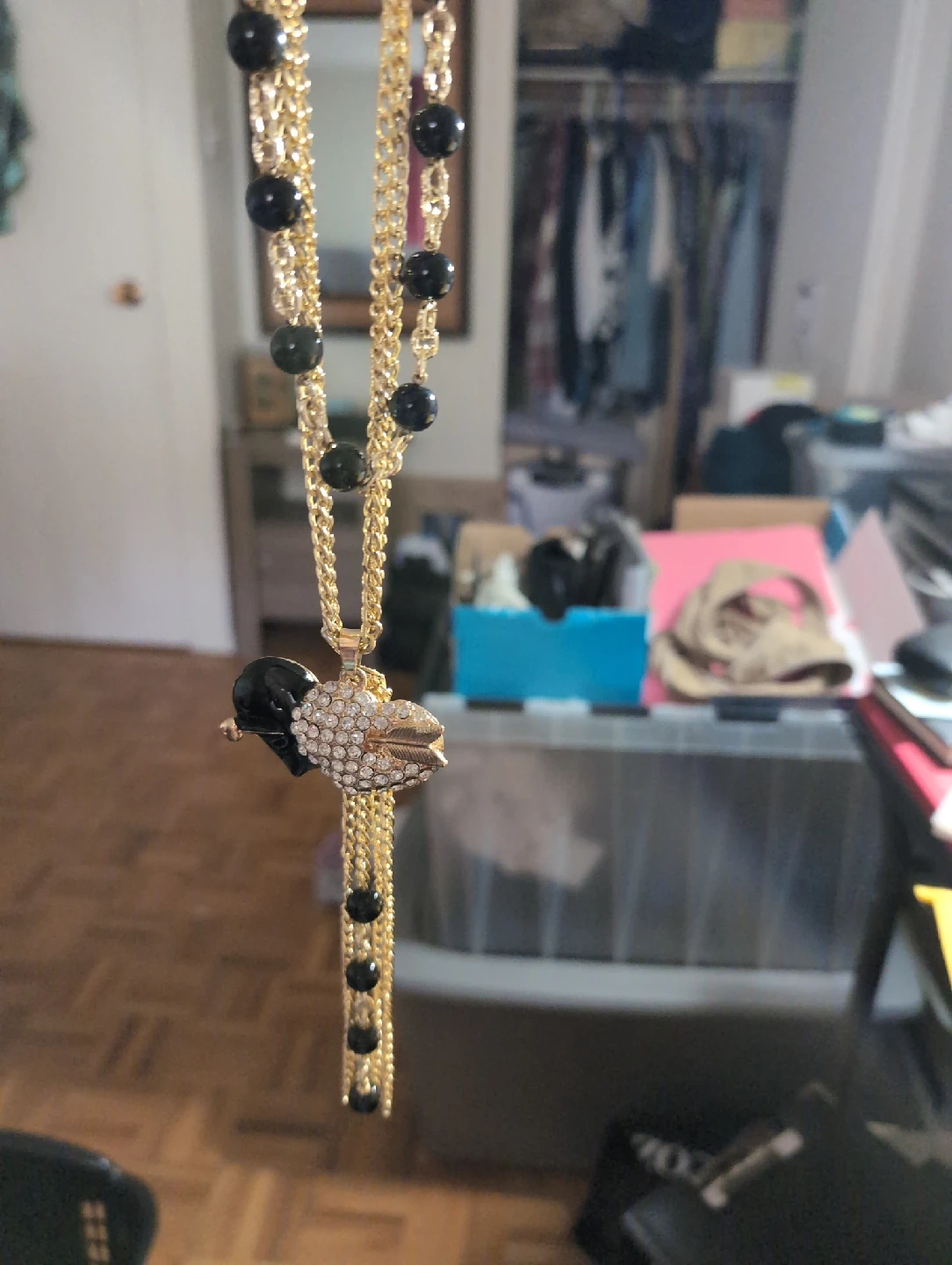 115Selling a gold-tone necklace with a unique Double Heart pendant. The pendant features rhinestones and black beads for a stylish look. Perfect for adding a touch of flair to any outfit!
