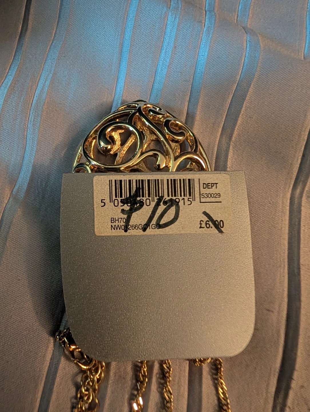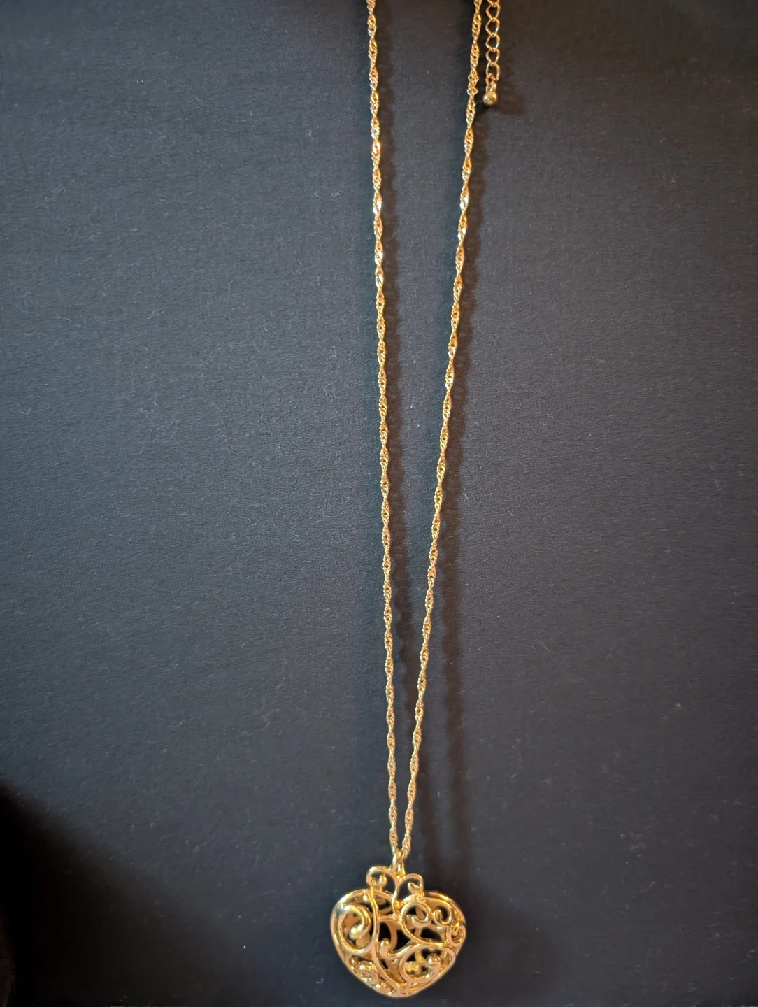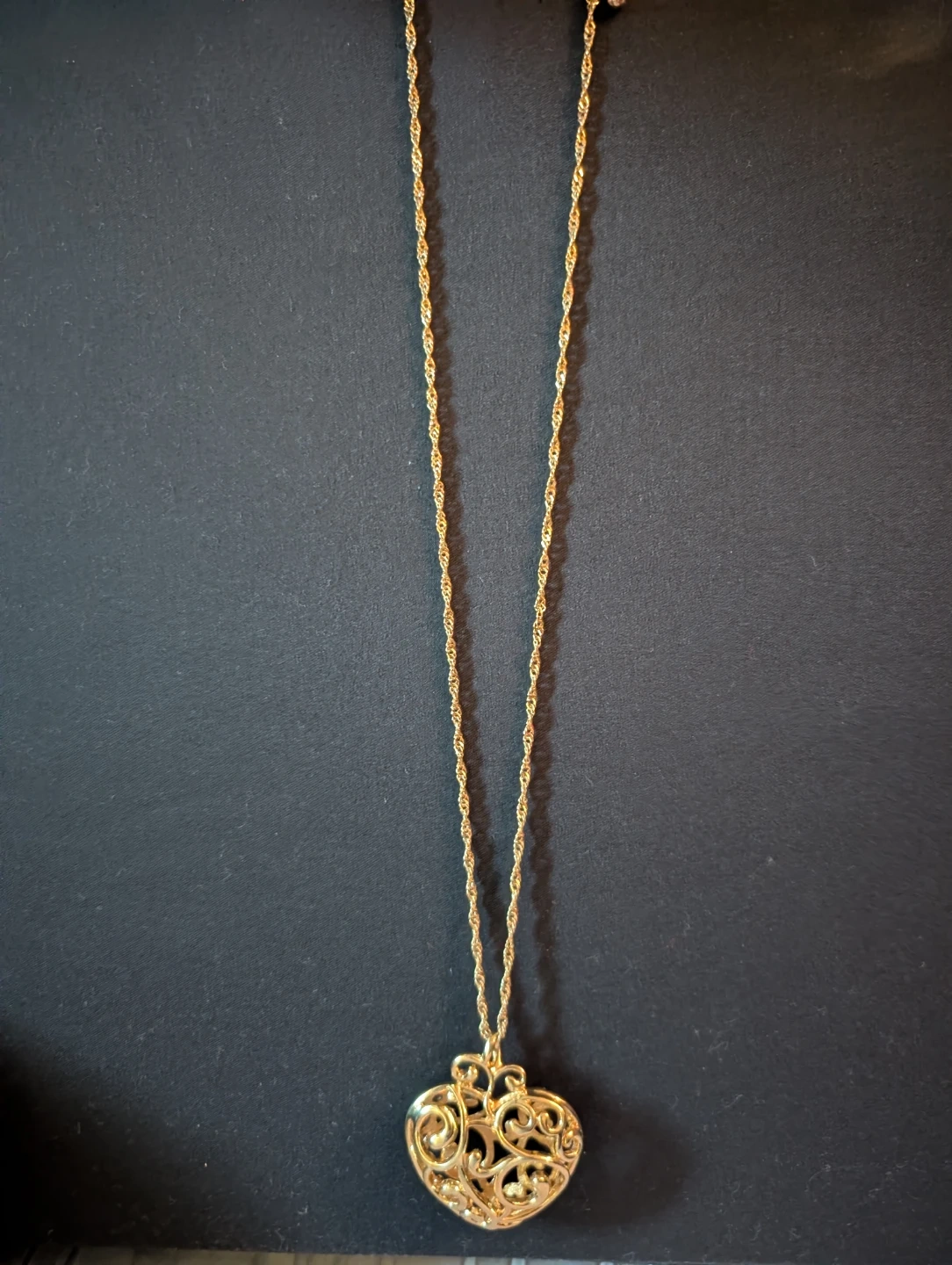 89Selling a lovely gold-tone heart pendant necklace. The pendant has a beautiful filigree design. It's brand new with tags attached. Ready for the holiday season or add a touch of elegance to your outfit!