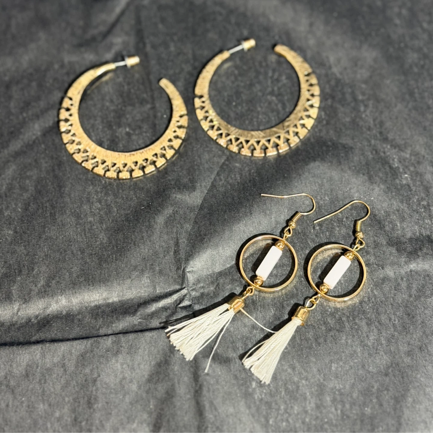 65Selling a set of two pairs of earrings. One pair features a gold tone hoop with intricate cut-out details. The other pair has a gold tone circle with a white bead and a cute white tassel. Perfect for adding a little flair to your outfit!