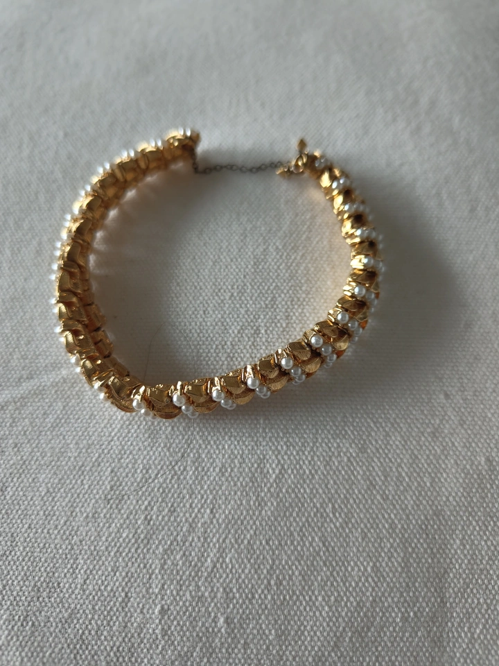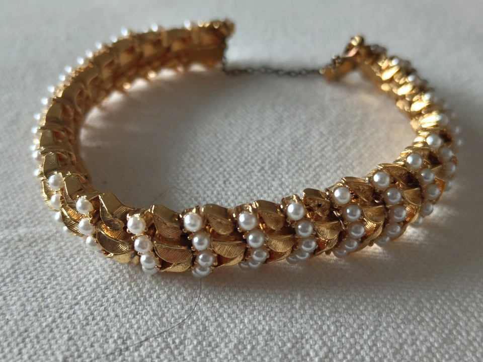 336Vintage gold tone bracelet. Features small faux pearls. Flexible design. Clasp closure.