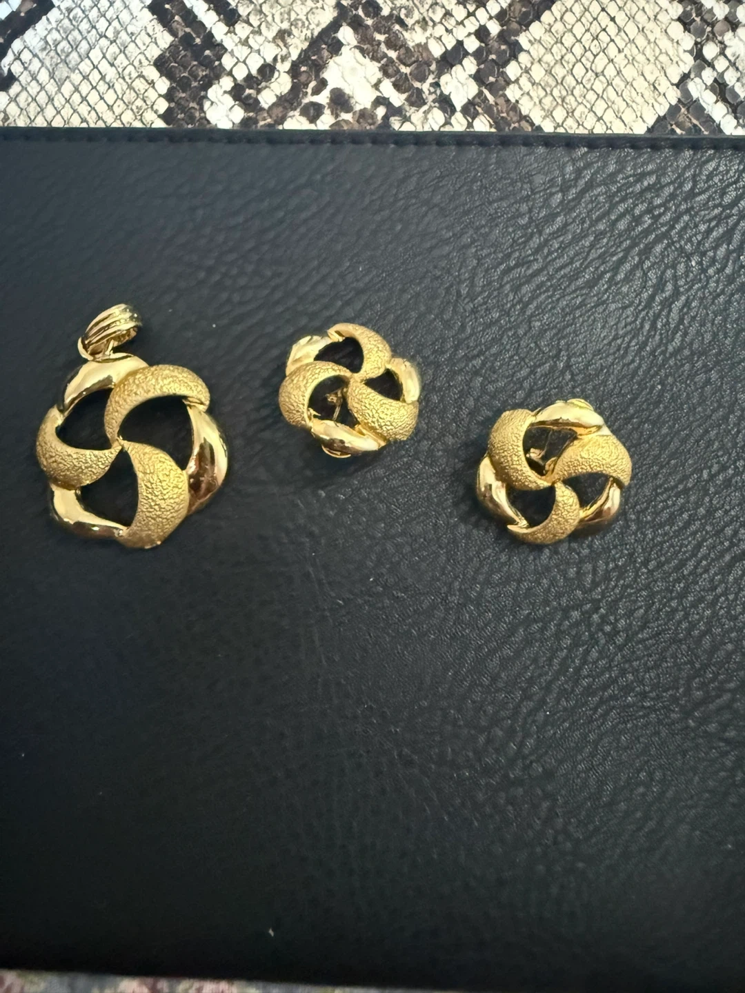10Selling a lovely gold-tone pendant and earring set! The set includes a pendant and a pair of earrings with a unique floral design. Perfect for adding a touch of elegance to any outfit