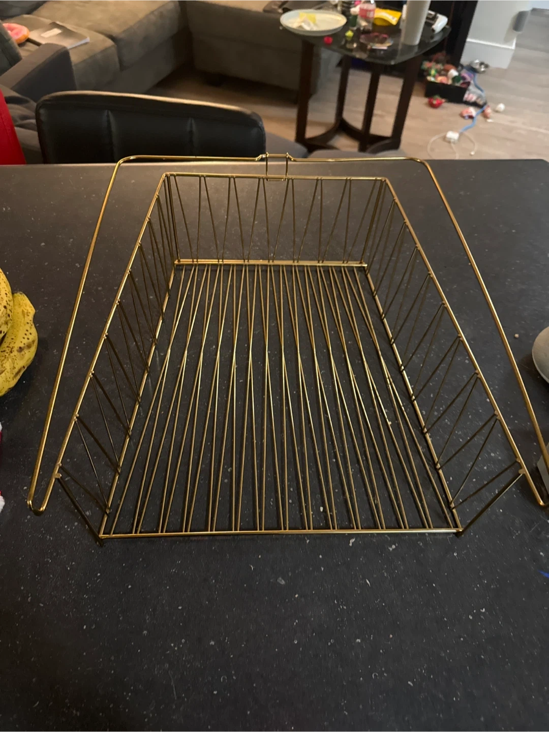 10Selling a gold wire basket! It's a stylish and functional piece for organizing your home. It could be used in the kitchen, bathroom, or any room where you need a bit of extra storage
