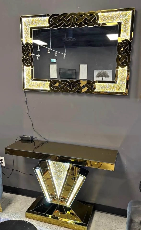 10A console and mirror set is a furniture combination typically consisting of a console table and a mirror placed above it. It's often used in entryways, hallways, or living rooms to add functionality and aesthetic appeal. The console table provides a surface for placing items like keys, mail, or decorative objects, while the mirror adds depth and helps to create the illusion of a larger space.
