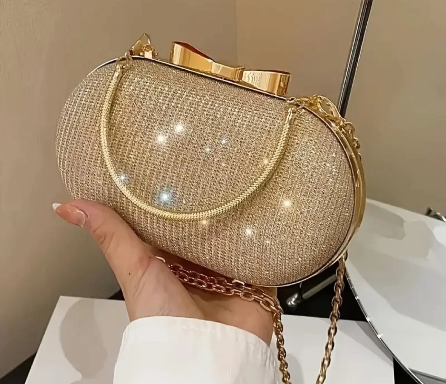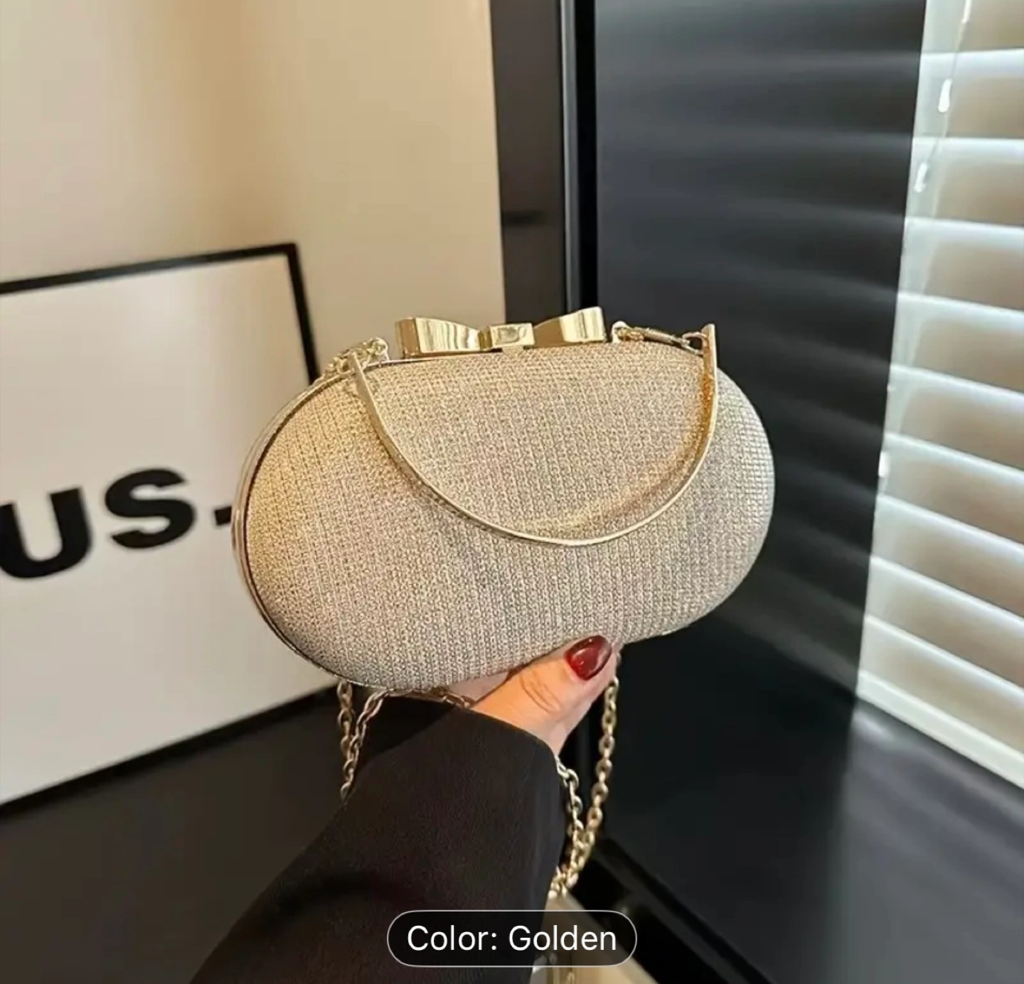 Selling a golden evening clutch, perfect for special occasions! The clutch features a delicate chain strap and a bow detail on top. The colour is a beautiful golden tone that will complement any outfit. It's in great condition and ready for a new owner!