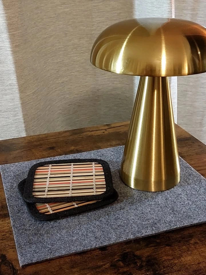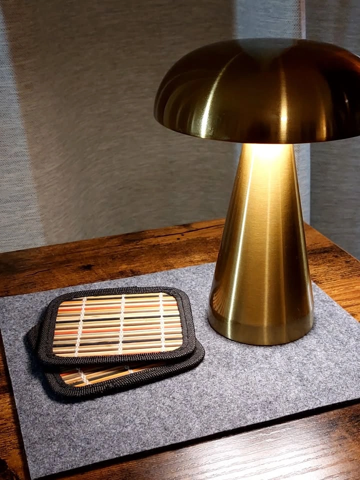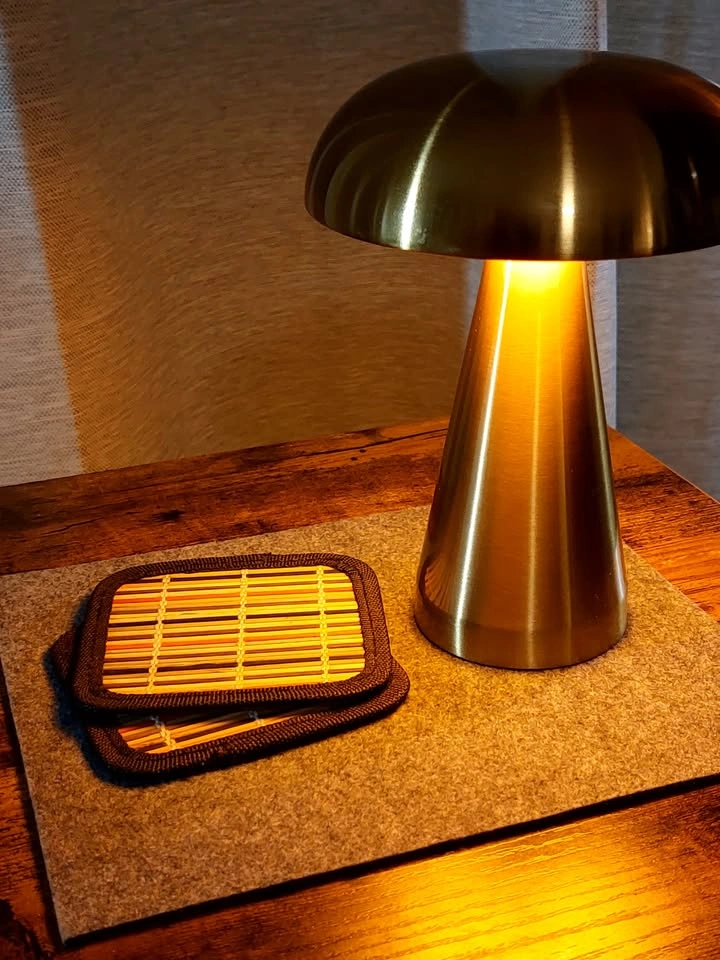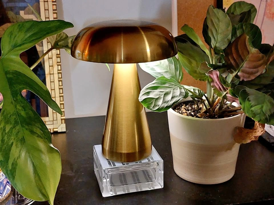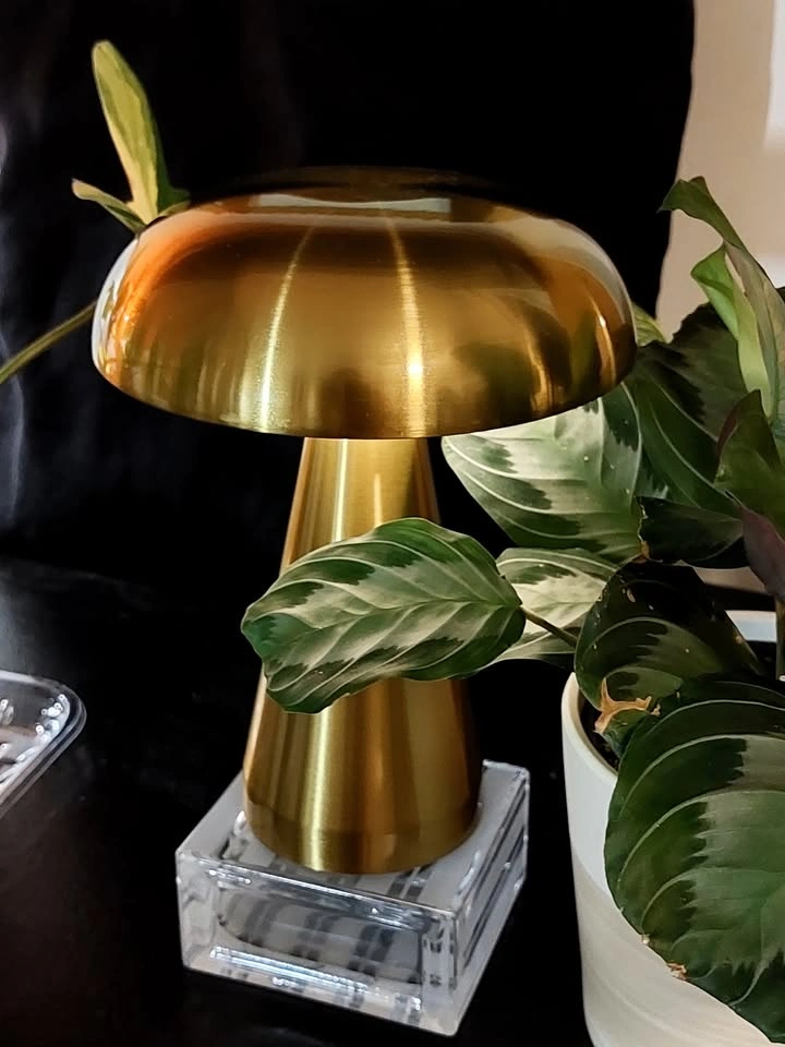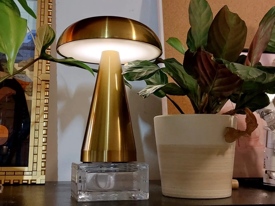 This is a portable, touch-activated LED mushroom lamp. It has three colour modes (warm white, cool white, mix) and stepless dimming. The internal battery is charged by USB. Like new.