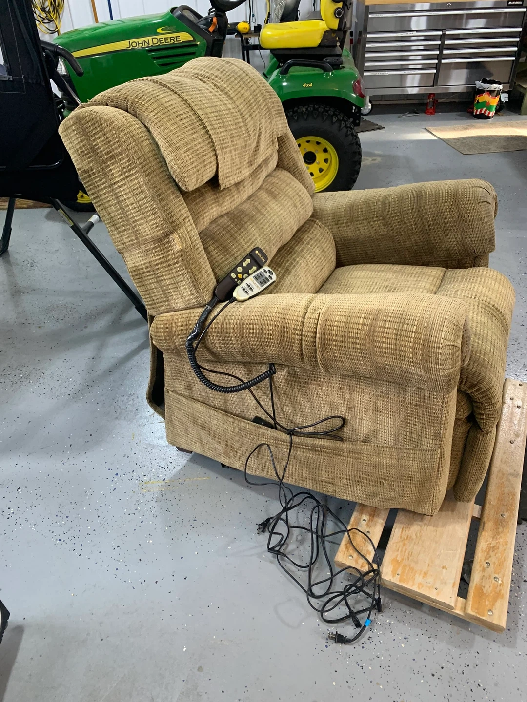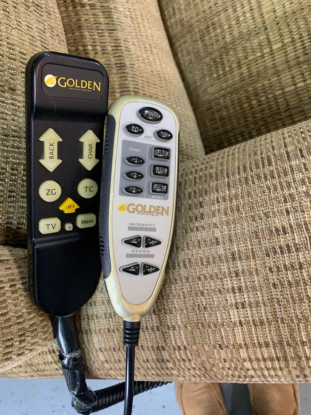 60Selling a Golden Technologies lift chair recliner. It's in good condition and has 2 remote control for easy operation. Perfect for anyone needing assistance getting in and out of a chair! Zero Gravity, 3 heat & Vibrating massage therapy. Ideal for disc & back problems. In very good condition. Everything works fine. This chair cost me over 3,000$. Selling because I am moving.