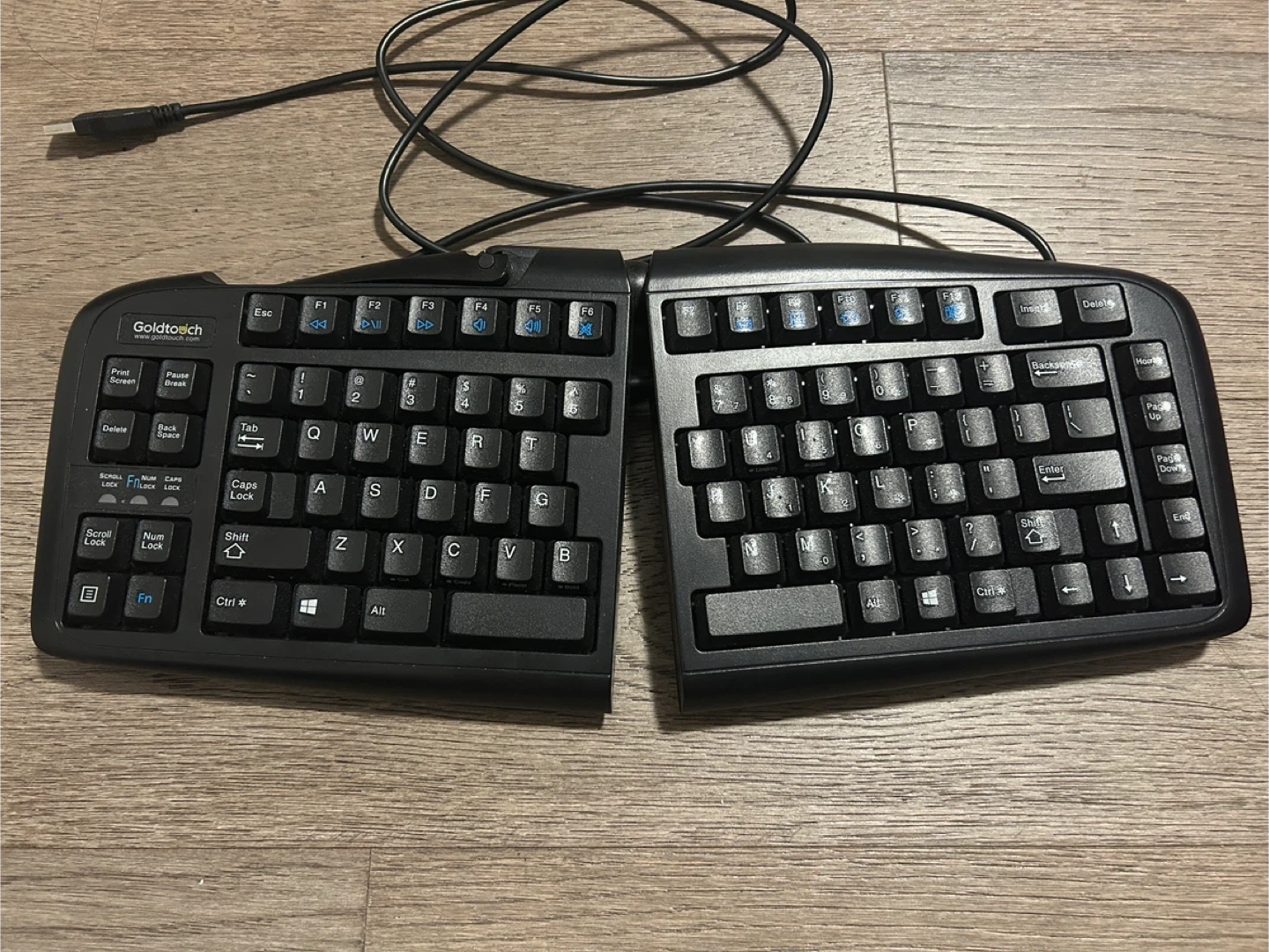 Selling a Goldtouch ergonomic adjustable keyboard in black. It's designed to provide a more comfortable typing experience. Great for anyone looking to improve their workstation setup!