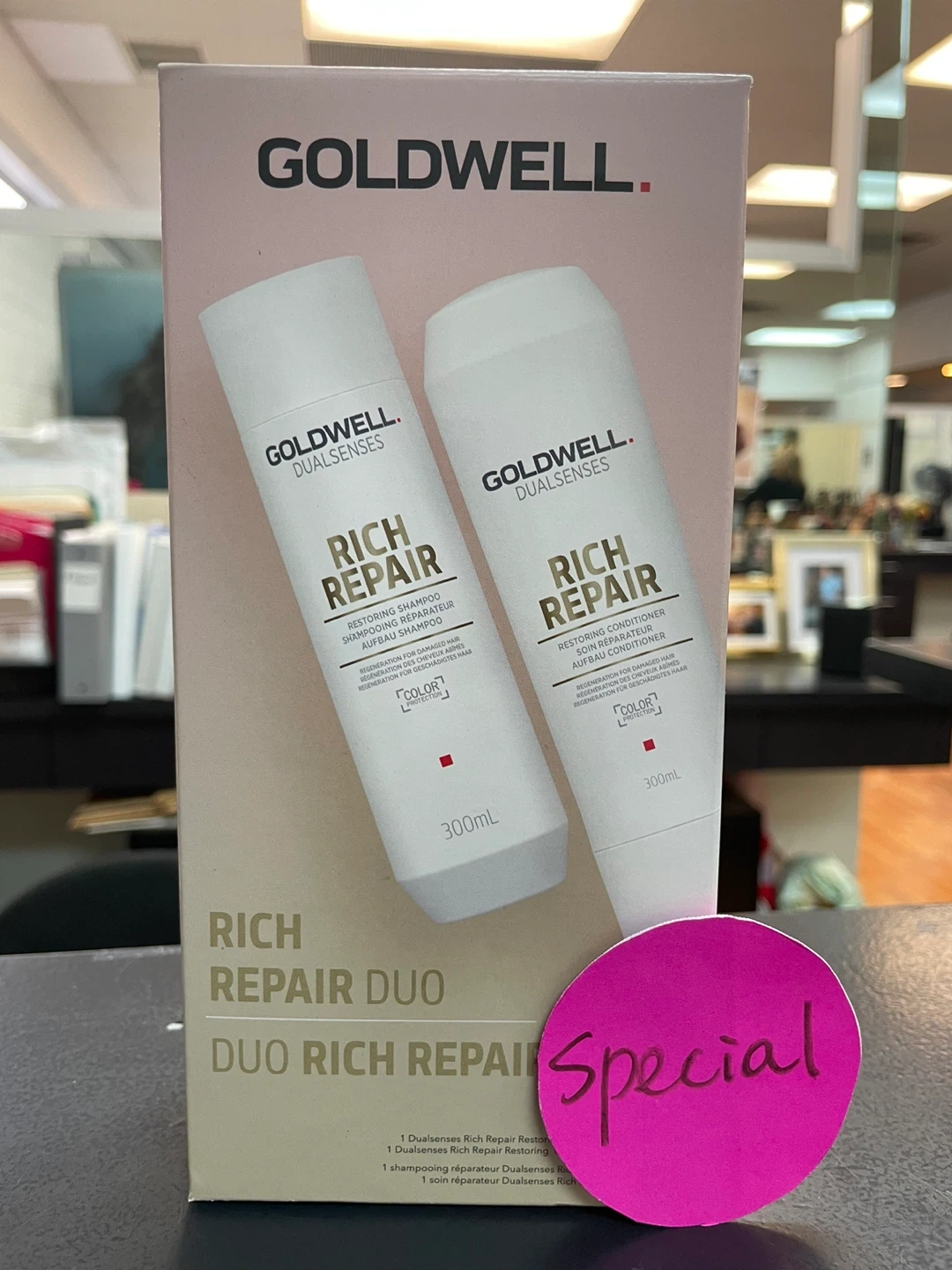 Goldwell Dualsenses Rich Repair Valuable packages This set includes a restoring shampoo and conditioner, both 300ml. Perfect for damaged hair and regeneration for colour treated hair!