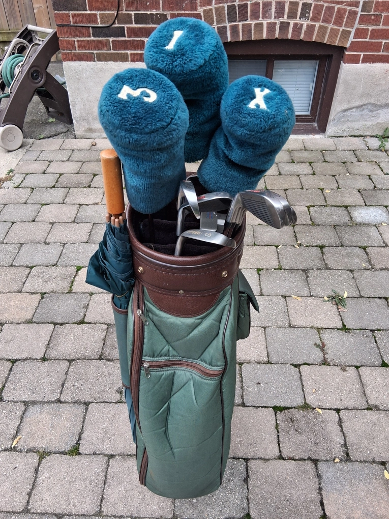 60selling my golf bag with umbrella and 12 clubs. Wilson. There are also 30+ balls. Clubs are right handed. set is ready to play I have not played with since 2024 so I decided to sell.