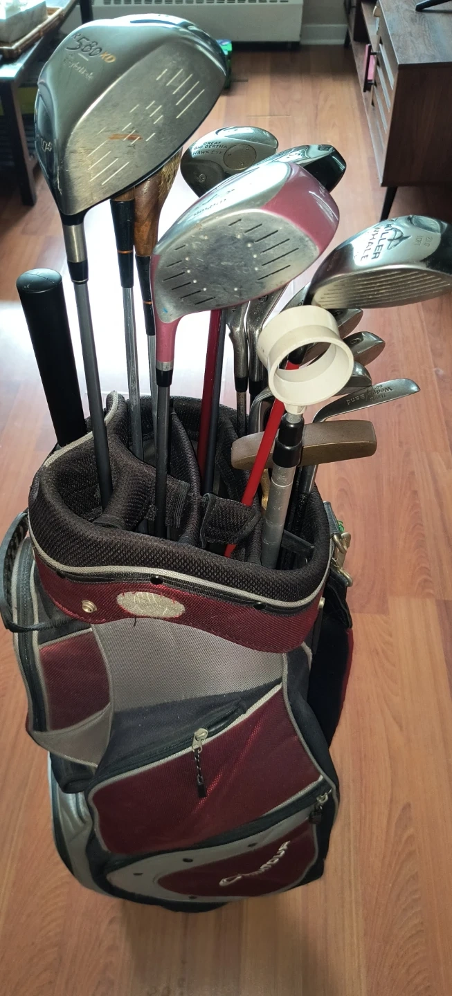 15Selling a set of golf clubs, including various irons, drivers, and a golf bag! Brands include Strata and Wilson. Nike Air Max golf shoes size 11 only worn for 3 rounds. XL Carbon fibre shaft golf umbrella from the RBC canadian open, never used. Boxes of brand-new golf balls, 1 pack Titleist and 4 packs of Taylor Made, 3 balls in each box. Buy as a set everything included for 400 OBO or let me know what you interested in and we can set a price for individual pieces.
