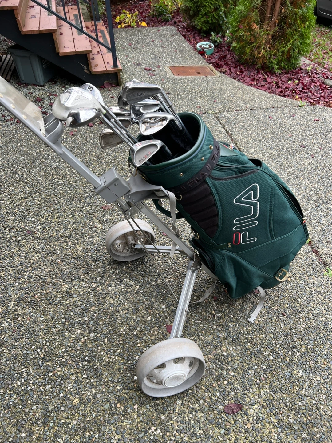 10Selling a set of golf clubs, including brands like Dunlop, Callaway, Pro Select, Lynx, Taylor Made. Comes with a Fila golf bag and a golf cart. Great for beginners or anyone looking to upgrade their set Pro Select driver Dunlop 3 and 5 fairway wood Calaway Big Bertha 4 wood Lynx 2 iron Camber Supreme 3-7 iron and PW Wilson 9 iron Cobra r7 SW TaylorMade Burner AW Fila Golf Bag Push Cart $225