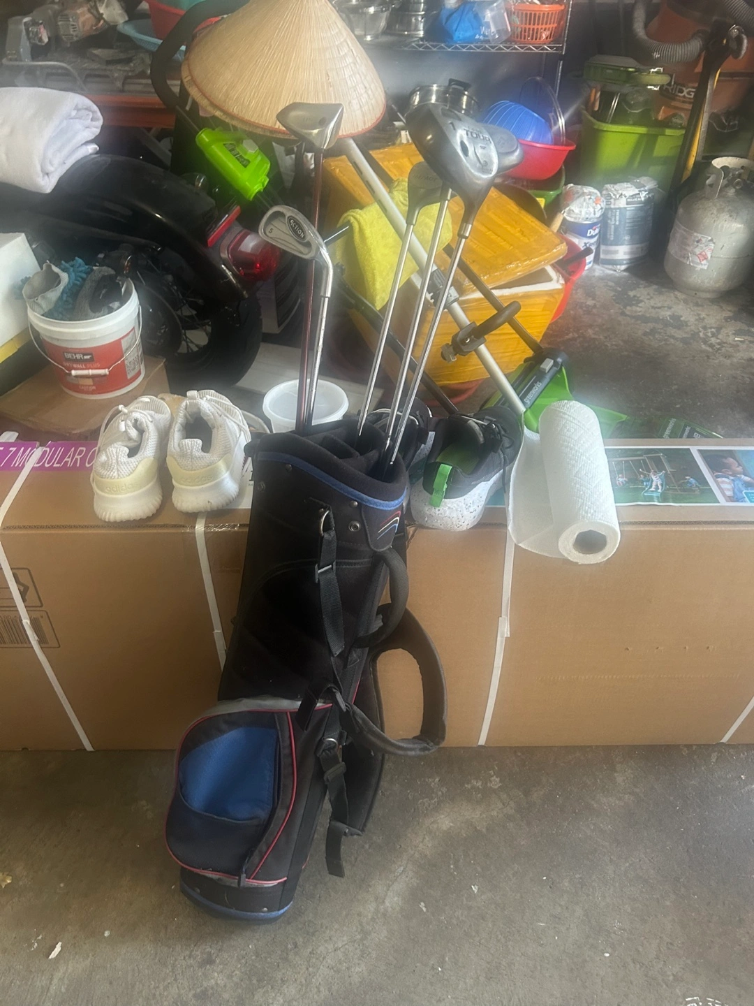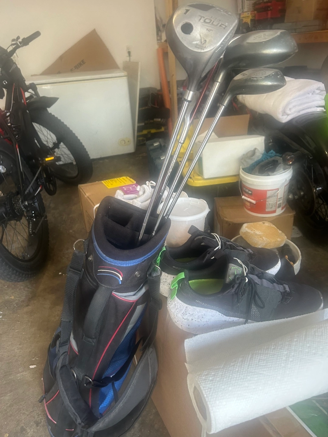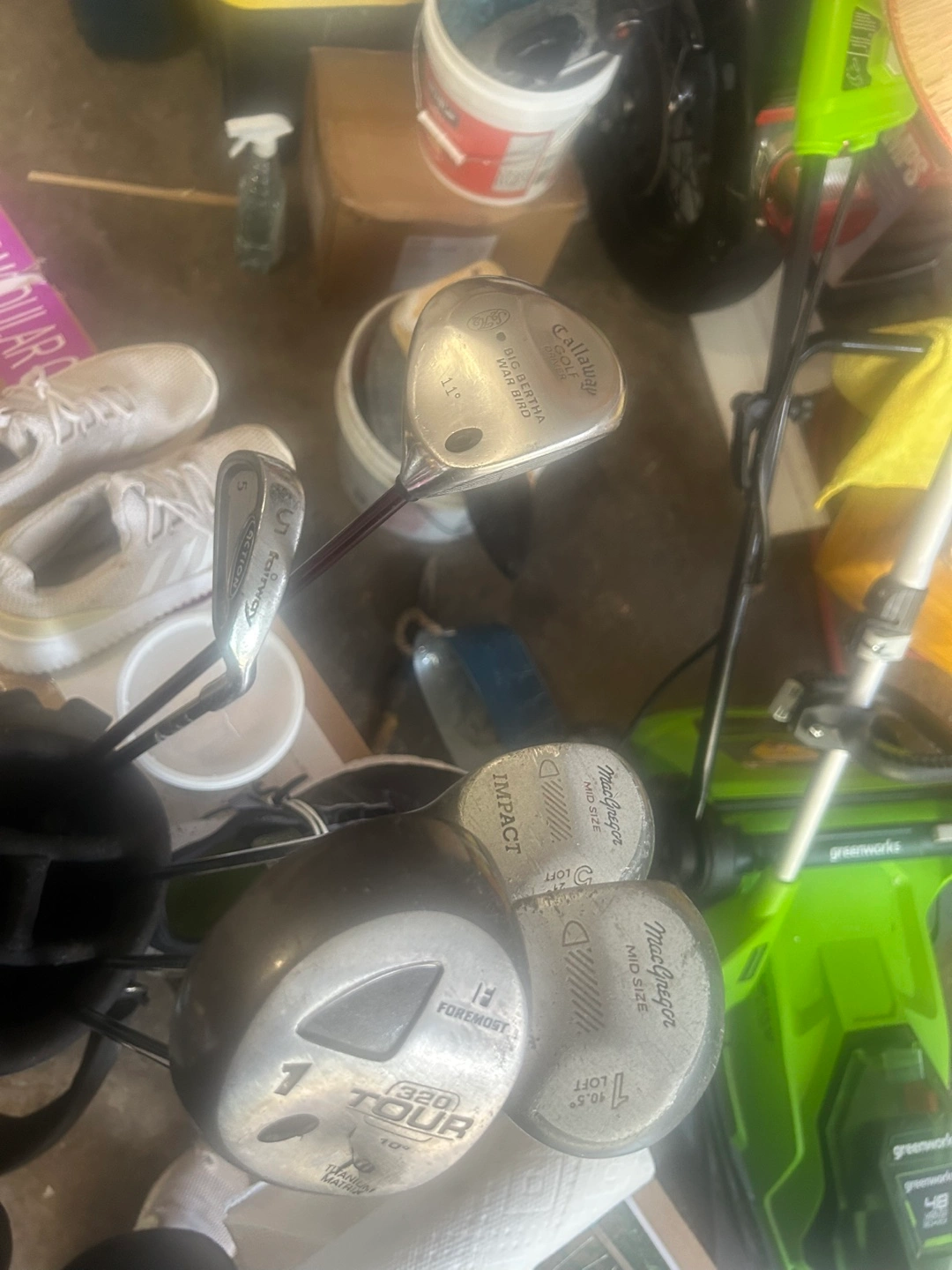 Selling a set of used golf clubs with a golf bag. The set includes various clubs, including a Tour 1 driver and Callaway clubs. Great for beginners or casual golfers looking for an affordable set!
