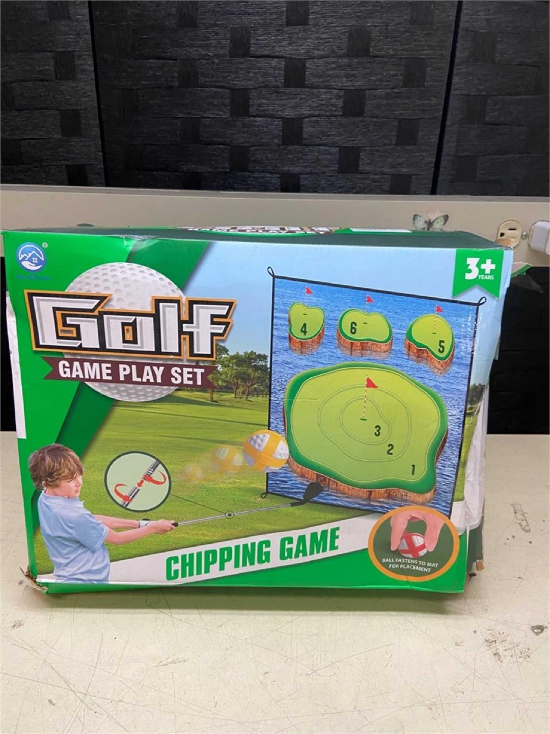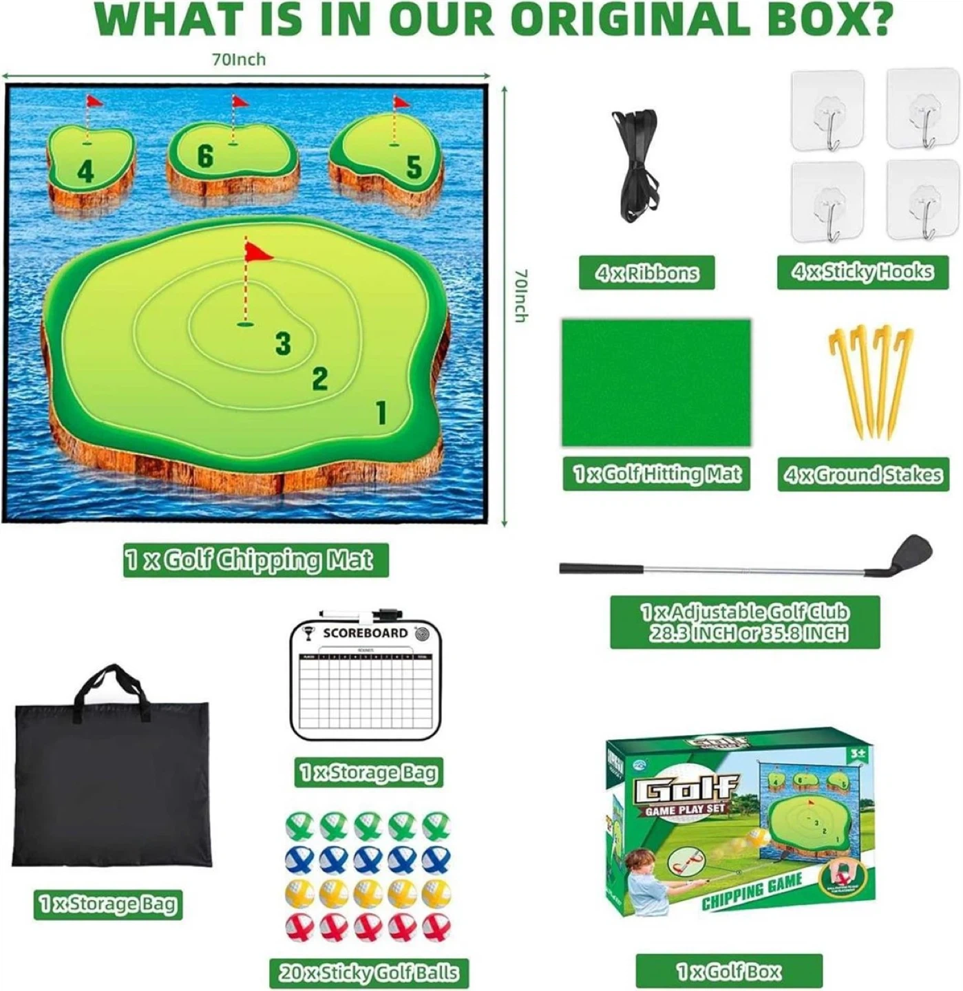 Get ready to tee off indoors with this Golf Game Play Set! It's a fun chipping game suitable for ages 3 and up. The set includes: - 1 x Golf Chipping Mat - 1 x Golf Hitting Mat - 20 x Sticky Golf Balls - 1 x Adjustable Golf Club (28.3 inch or 35.8 inch) - 4 x Ground Stakes - 4 x Ribbons - 4 x Sticky Hooks - 1 x Scoreboard - 1 x Storage Bag - 1 x Golf Box Everything you need for a fun game of indoor golf is included!